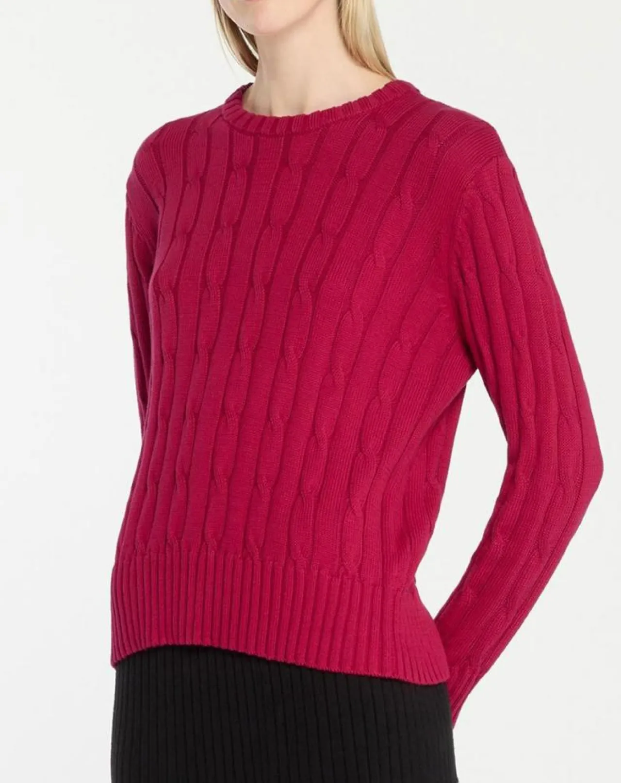 Ce pull droit Jodhpur en coton biologique est muni de torsades, d’un col rond et de finitions côtelées.