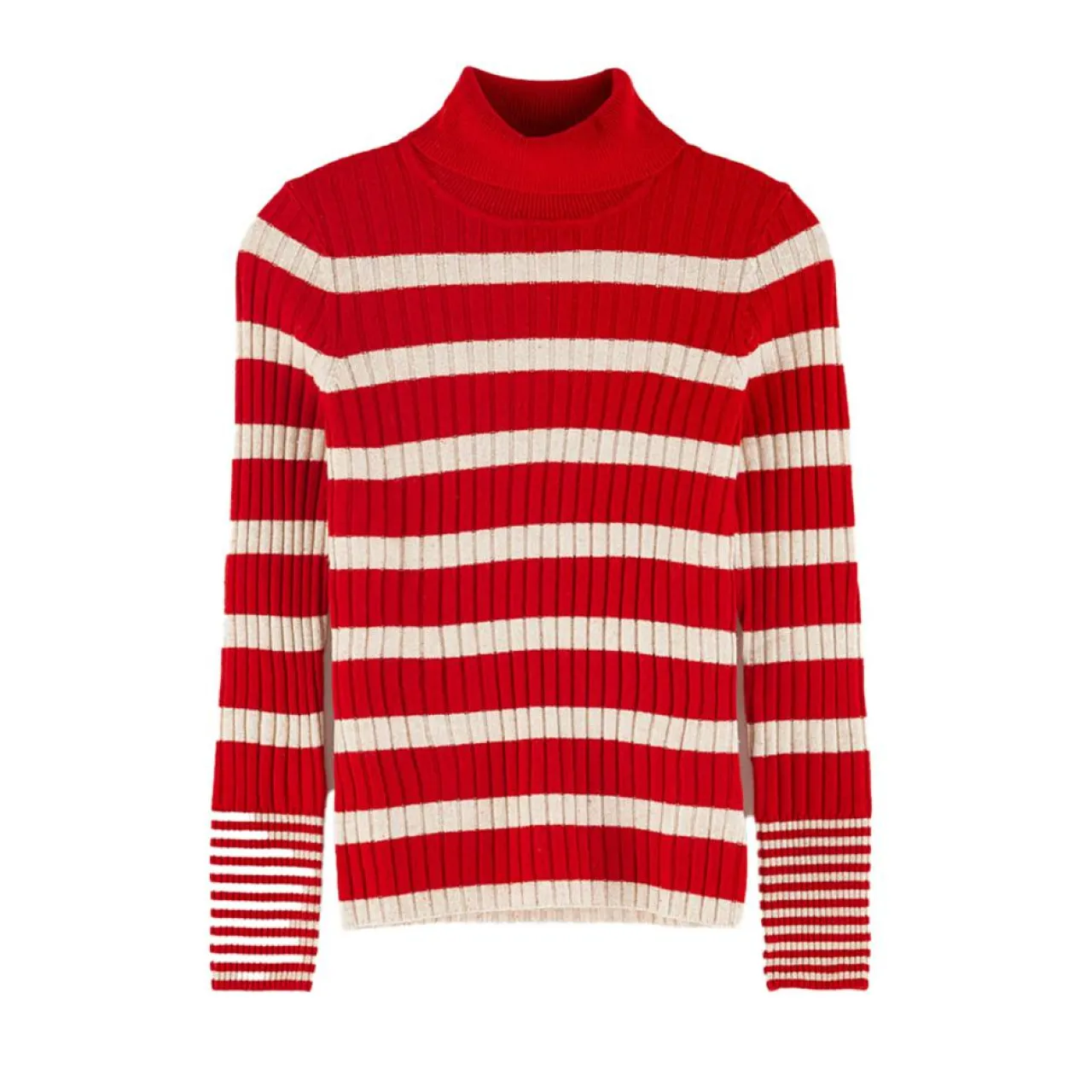 Pull slim à col montant en laine mérinos rouge avec rayures brillantes