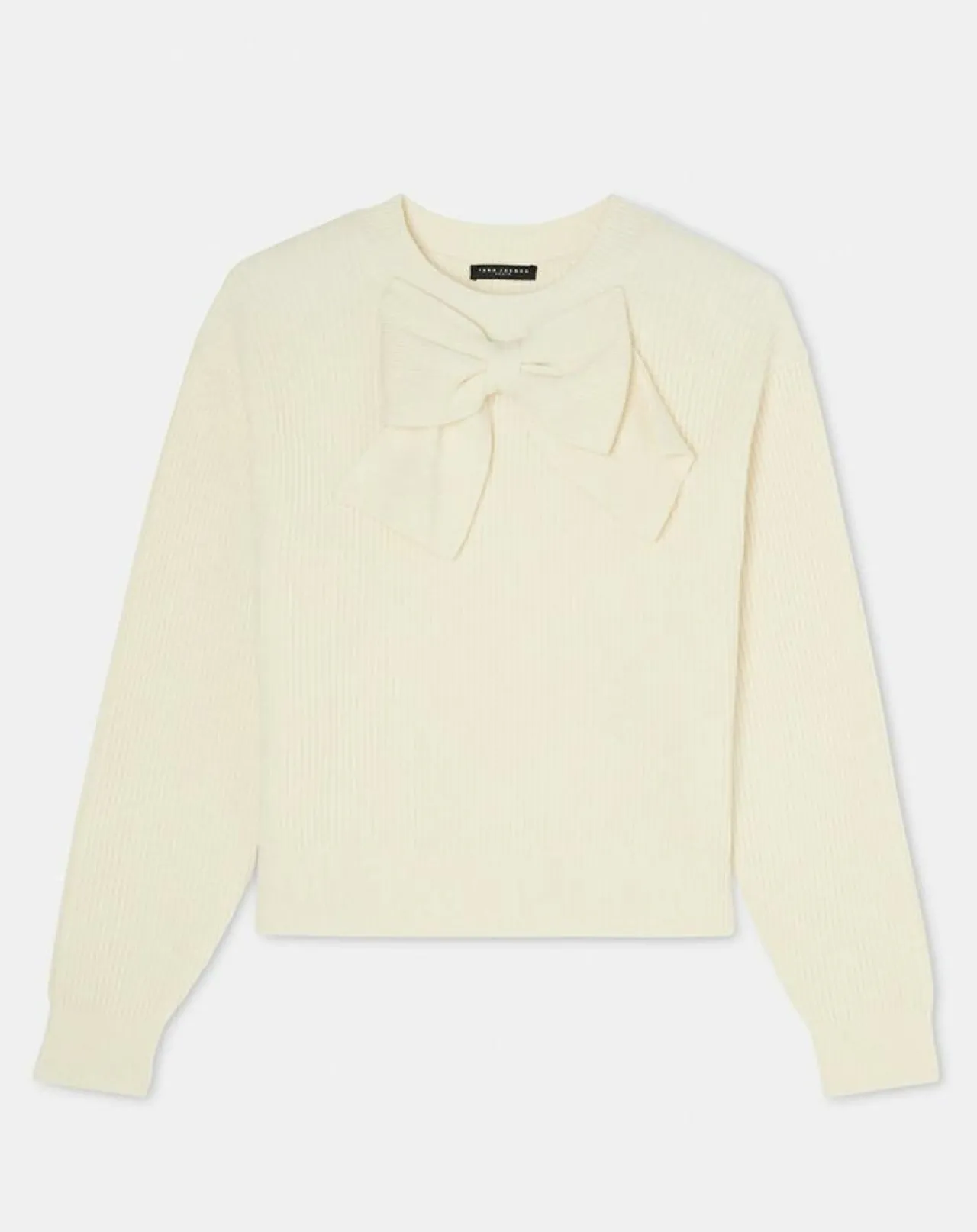 Ce pull en laine écru côtelé possède une encolure ronde et des manches longues
