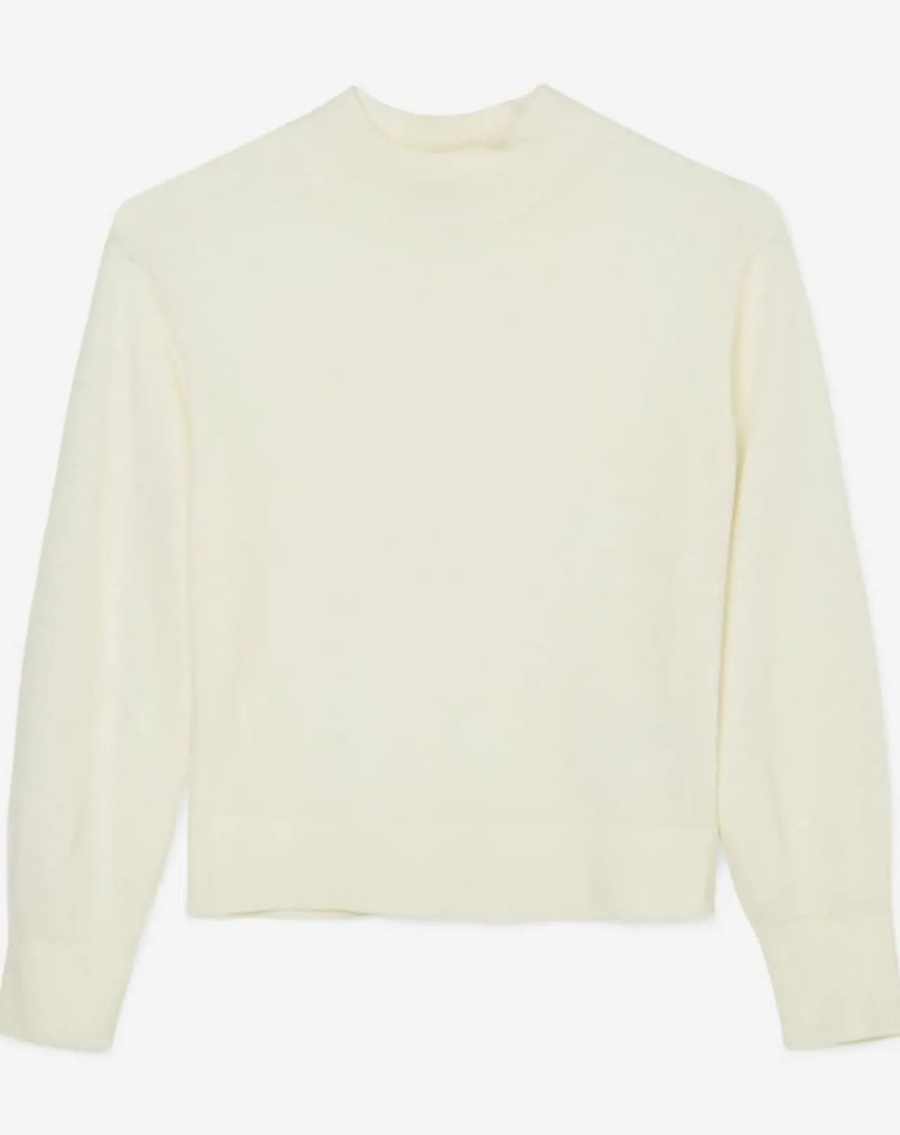 Cette pièce basique exclusive est dotée d’un col cheminée côtelé, d’épaules tombantes discrètes, de coutures inversées et de détails en tricot façonné le long de l’encolure.
