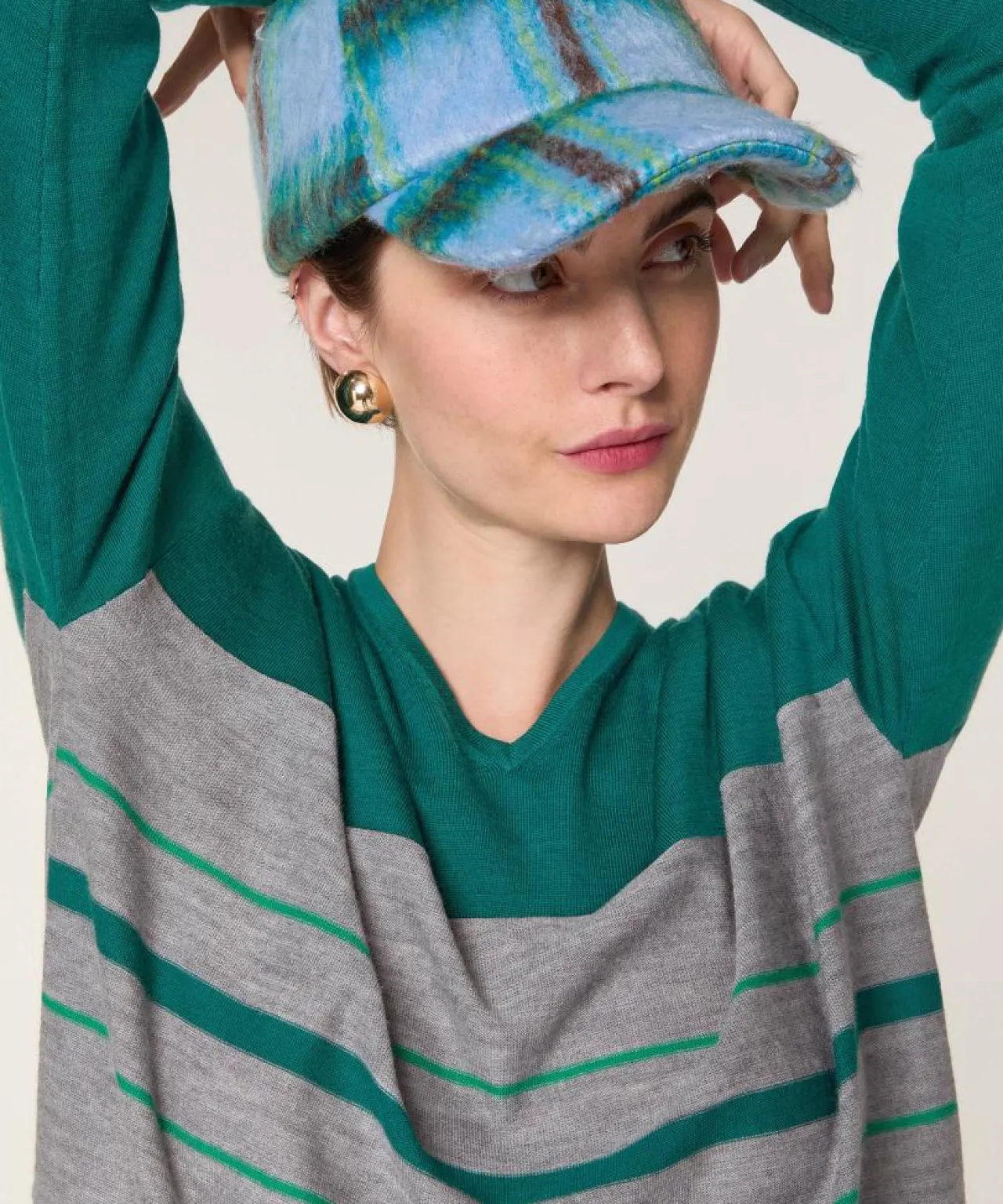Pull Anne-Élodie 100% Laine col V rayures vert canard