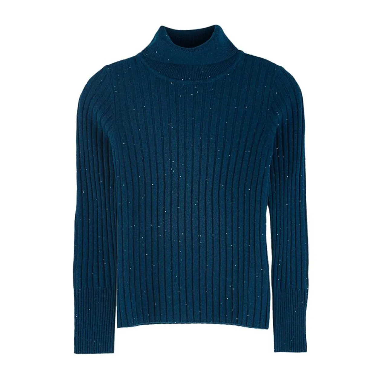 Pull slim à col montant en laine mérinos couleur bleu jean et fini brillant façon lurex