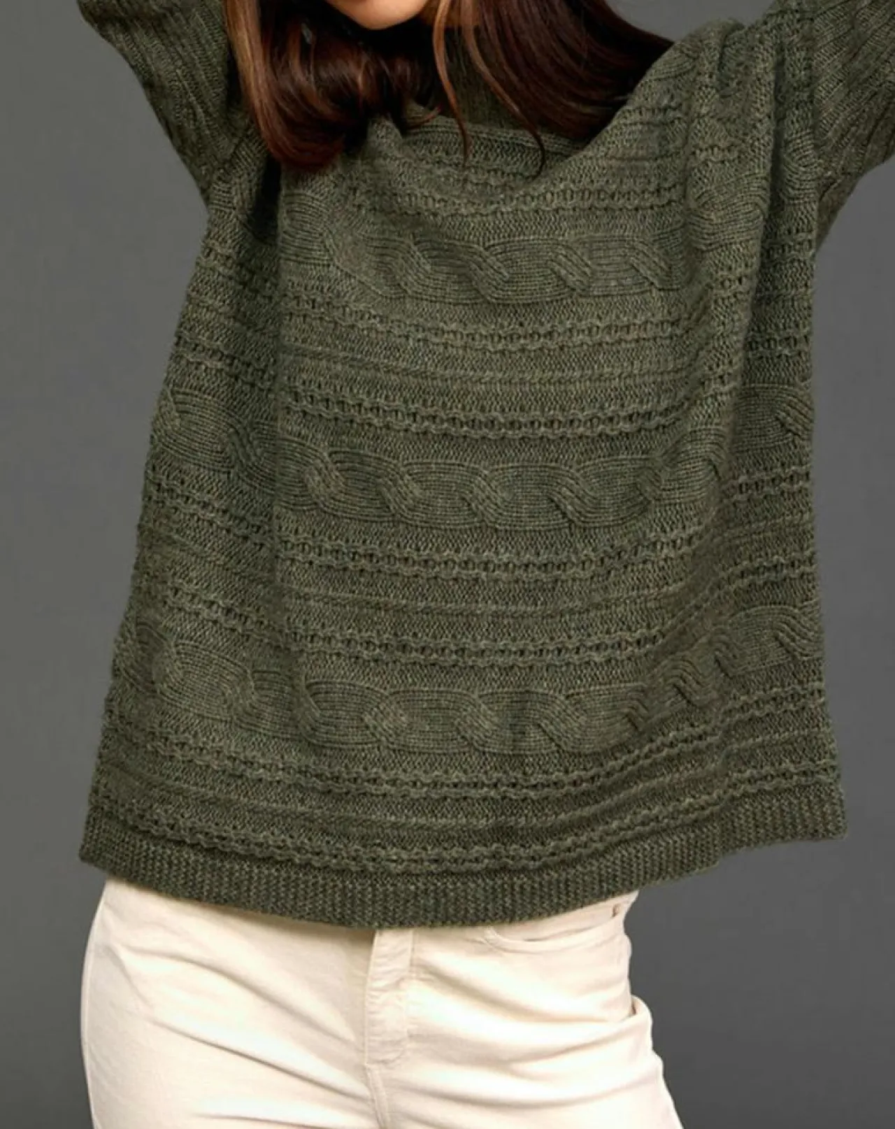 Pull torsadé en cachemire laine au col montant et manches tombantes tricotées en torsades horizontales