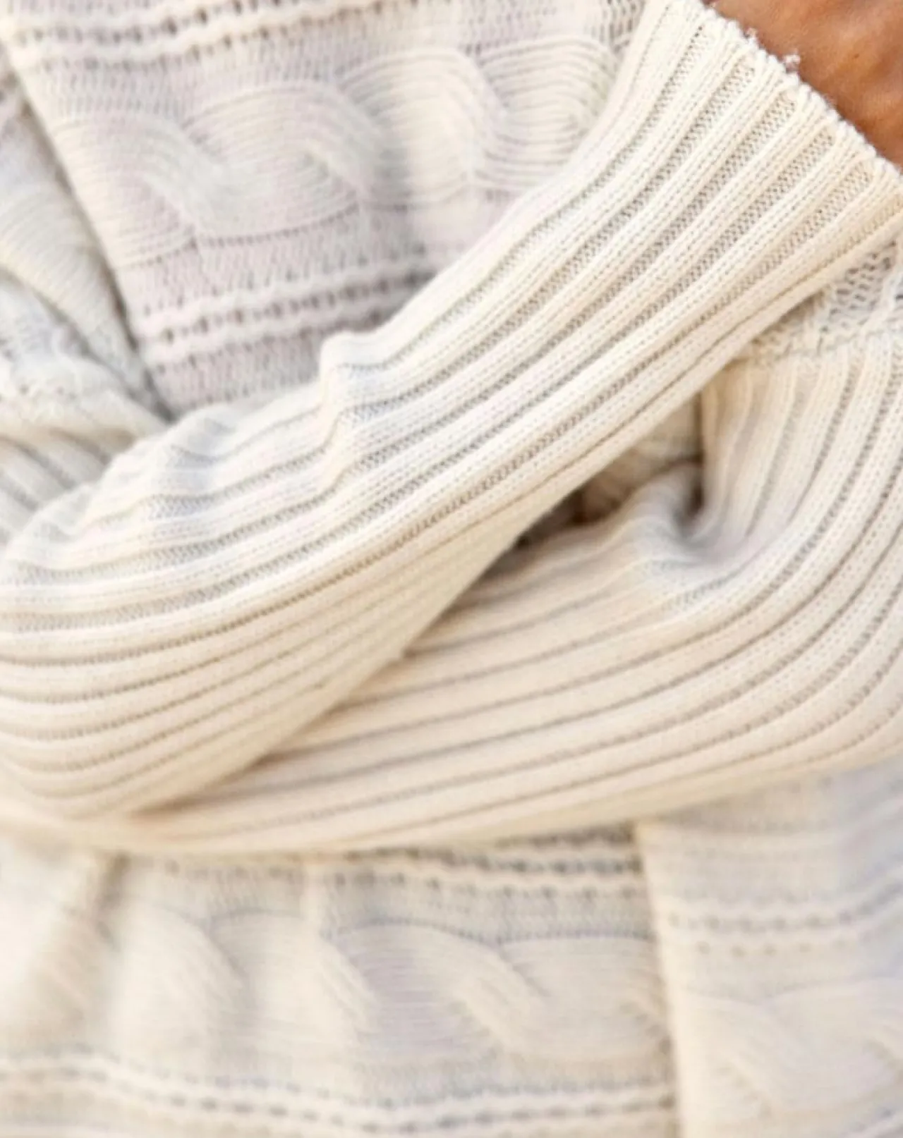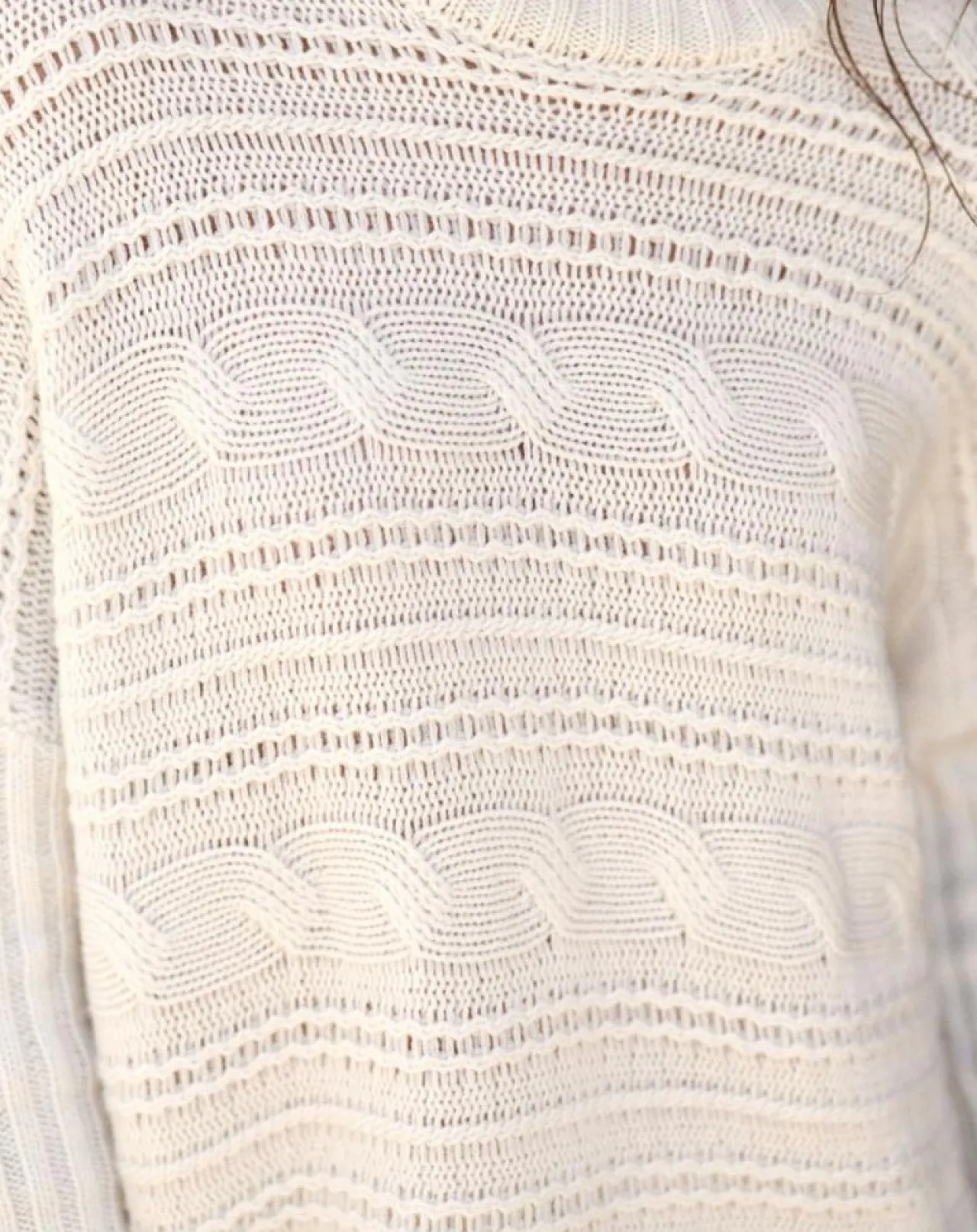 Pull torsadé en cachemire laine au col montant et manches tombantes tricotées en torsades horizontales
