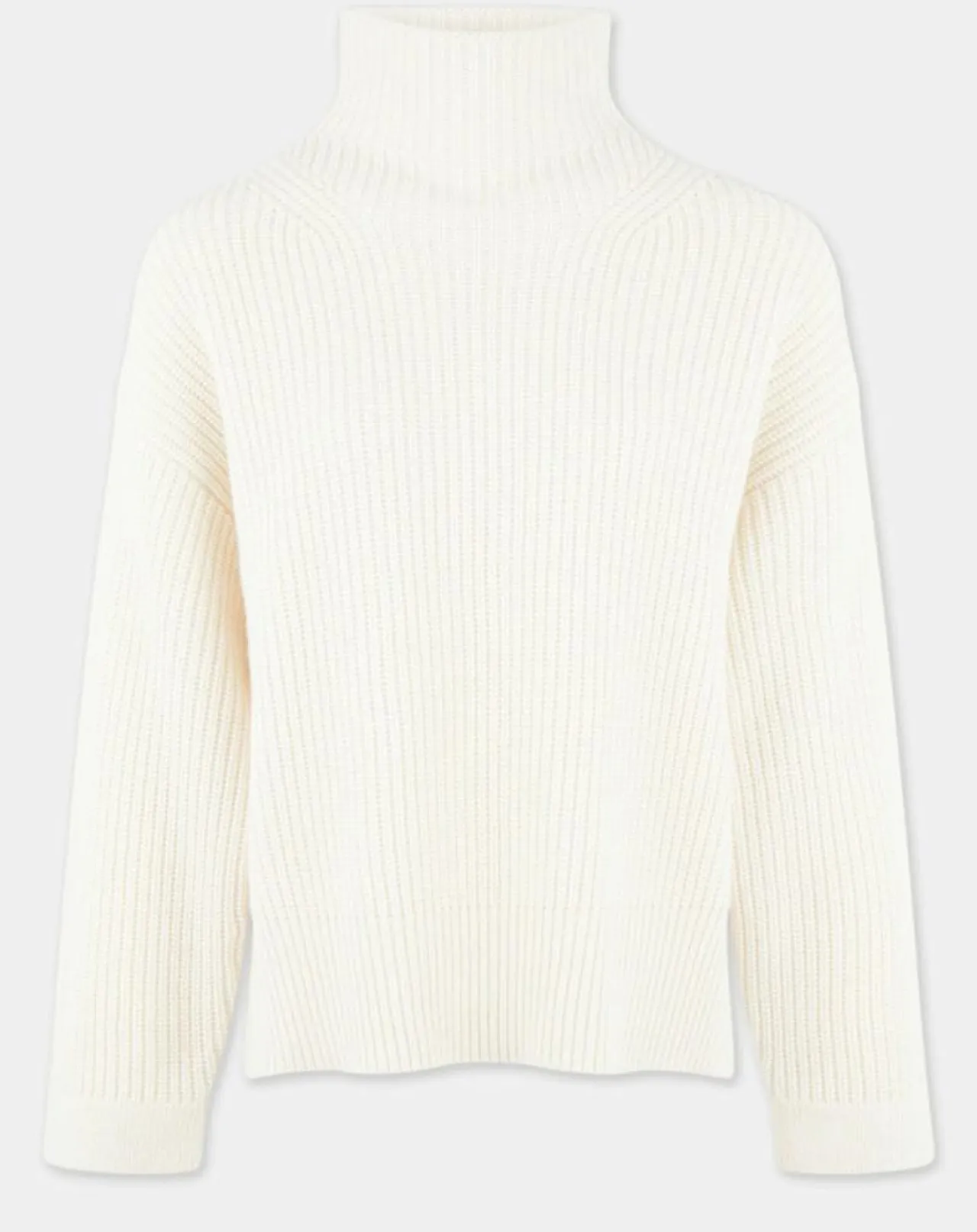 Ce pull Galeries Lafayette composé de laine et de cachemire responsable en maille à grosses côtes est muni d’un col montant et d’un ourlet fendu.