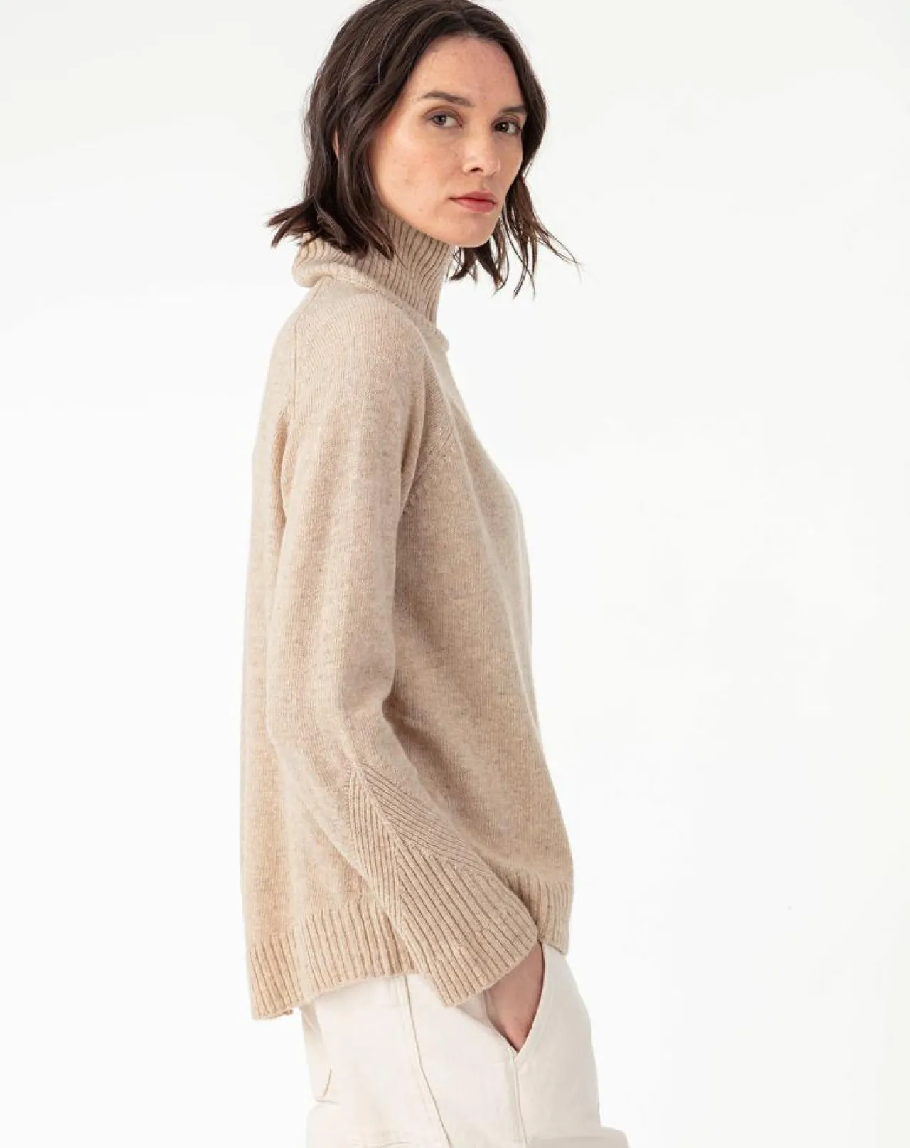 – Pull beige asymétrique – Fente bas milieu dos – 70% laine
