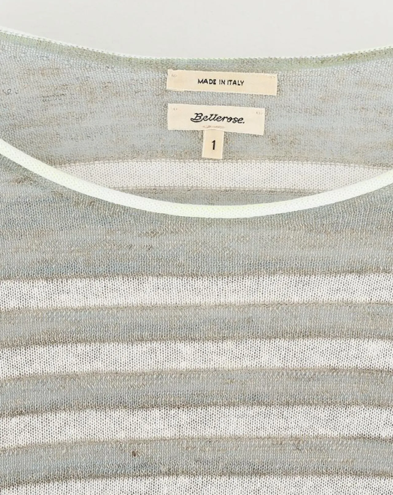 Doux, respirant et léger, Neep est un pull idéal pour l’été. Cette marinière en lin mélangé est dotée d’un col bateau roulotté contrastant, d’épaules tombantes et de manches 3/4. Ses rayures pâles à bords dorés iront à merveille avec vos pantalons clairs.