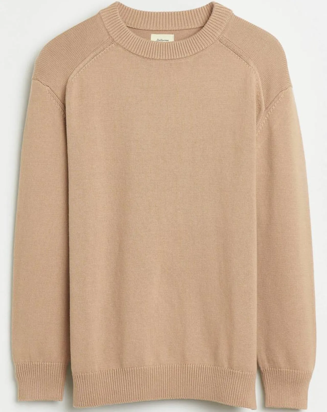 Ce pull est tricoté en pur coton avec une coupe décontractée, un col en tricot double et des épaules inclinées