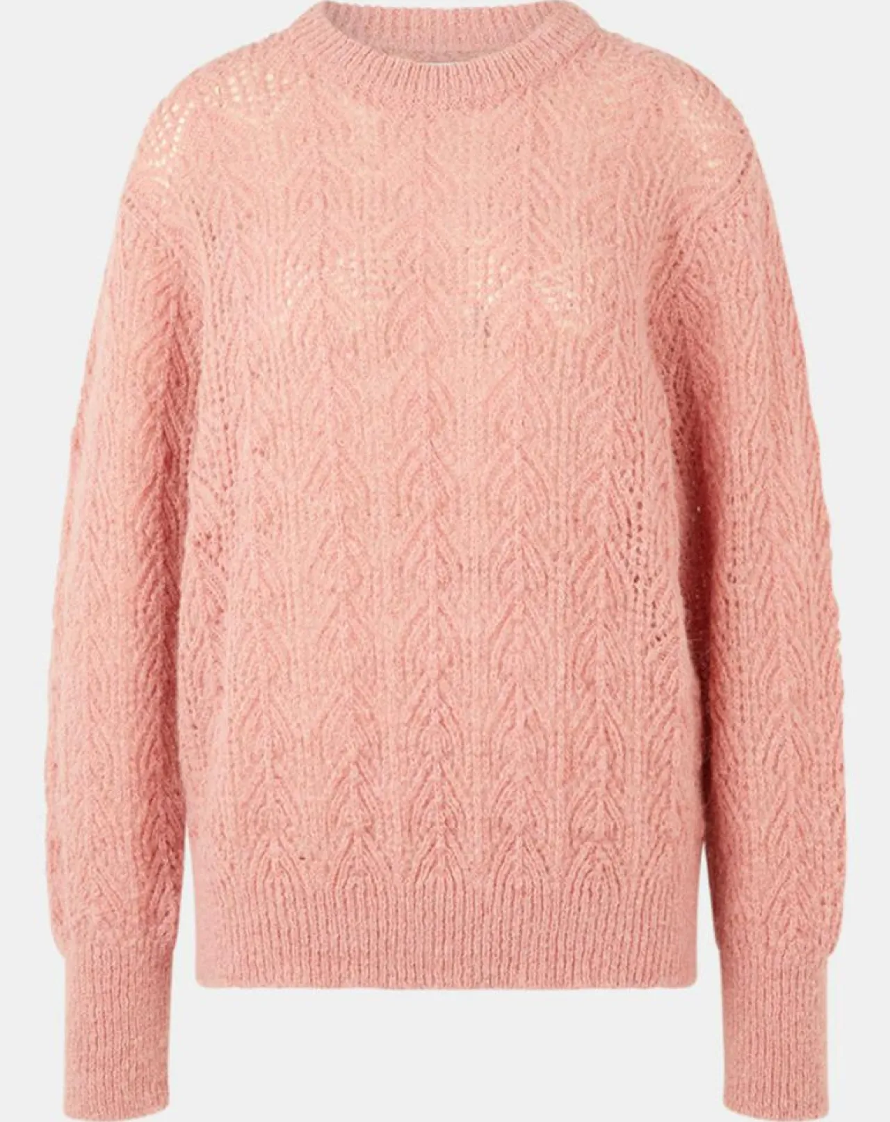 Ce pull droit Galeries Lafayette en maille pointelle mousseuse présente un col rond, des manches longues aux longs poignets ainsi que des finitions côtelées.