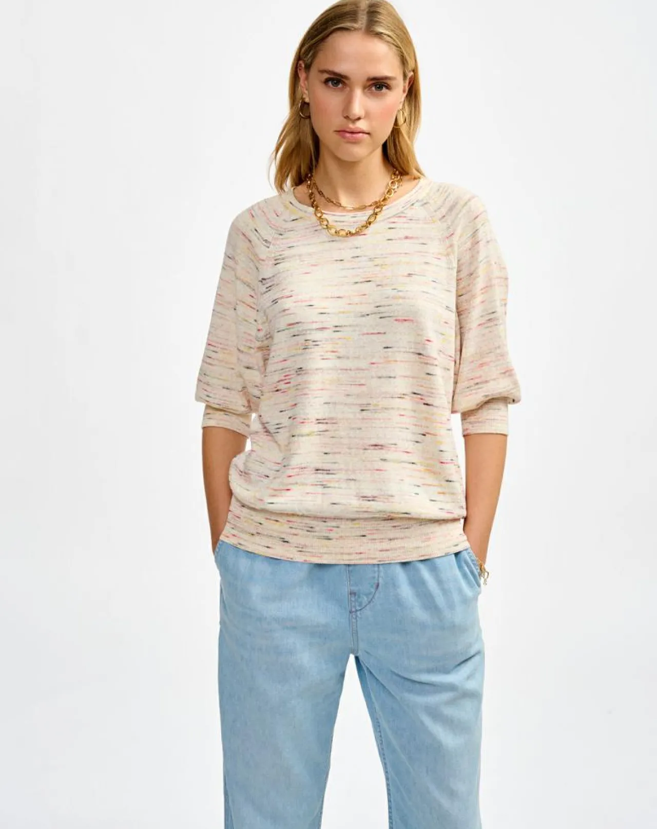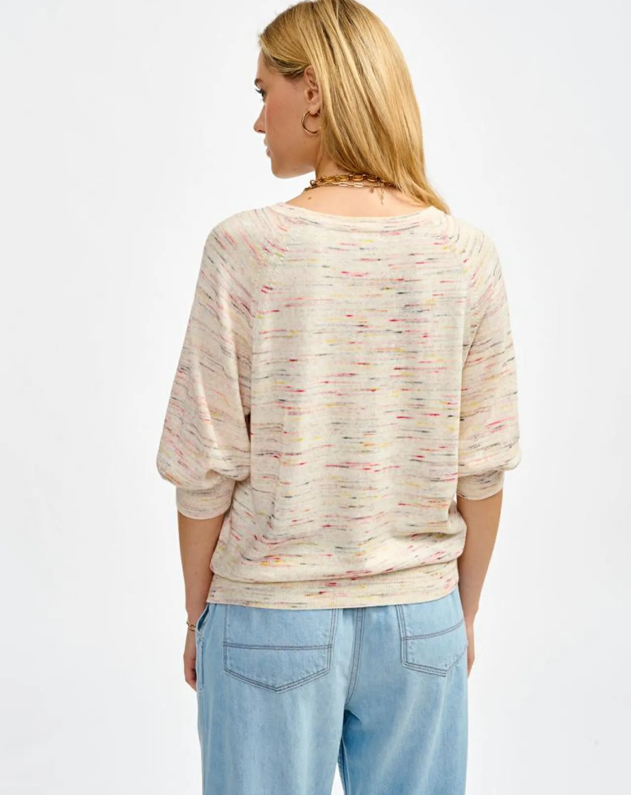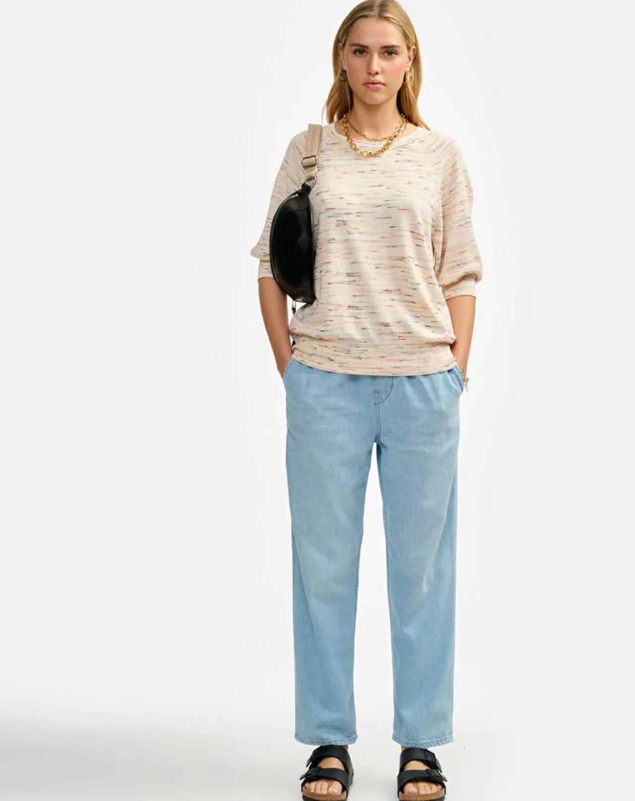 Classique, mais pas trop, le pull Galogy est tricoté à partir d’un fil imprimé de pur coton biologique avec des neps multicolores. Une pièce versatile, avec un col rond et des manches raglan, qui a sa place toute trouvée parmi vos basiques saisonniers.