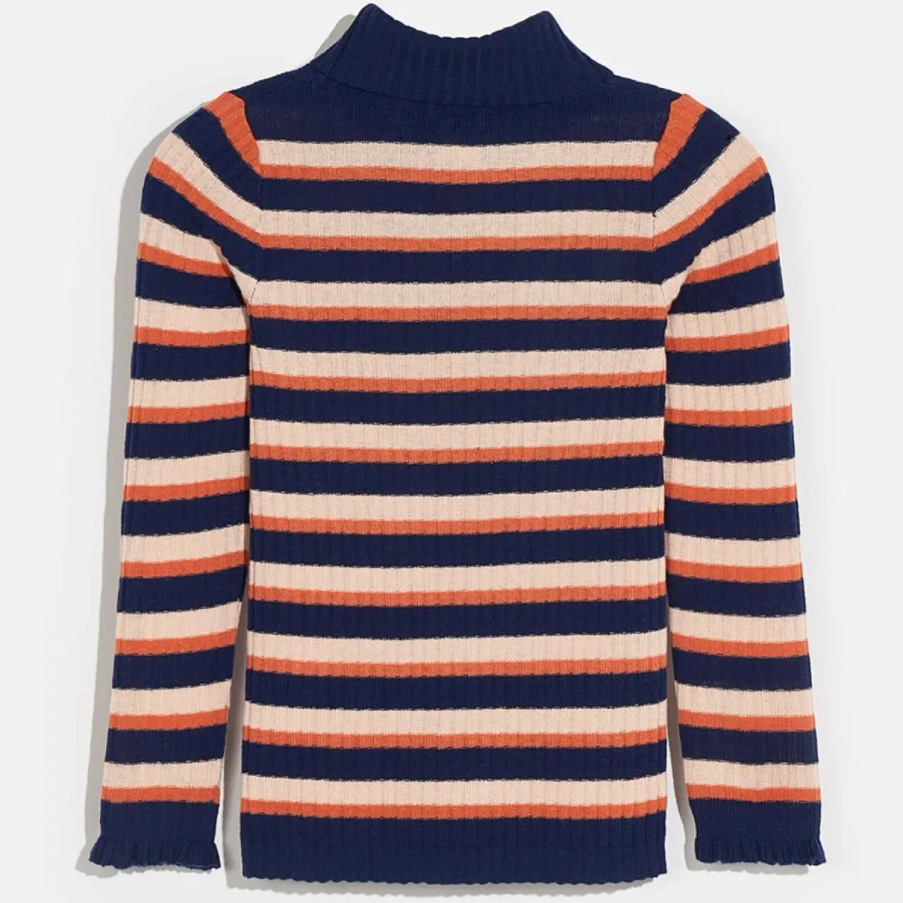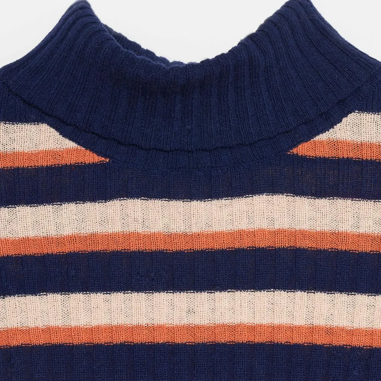 Pourquoi se contenter d’un basique quand on peut avoir Gouly ? Une coupe slim et côtelée qui flatte la silhouette, un col roulé pour un look toujours chic, des rayures bretonnes aux couleurs saisonnières et des manches à volants pour saupoudrer le tout d’un zeste de féminité : le pull parfait ! Tricoté en coton et laine mélangés, il convient à la mi-saison, mais aussi aux grands froids d’hiver comme petite couche en plus