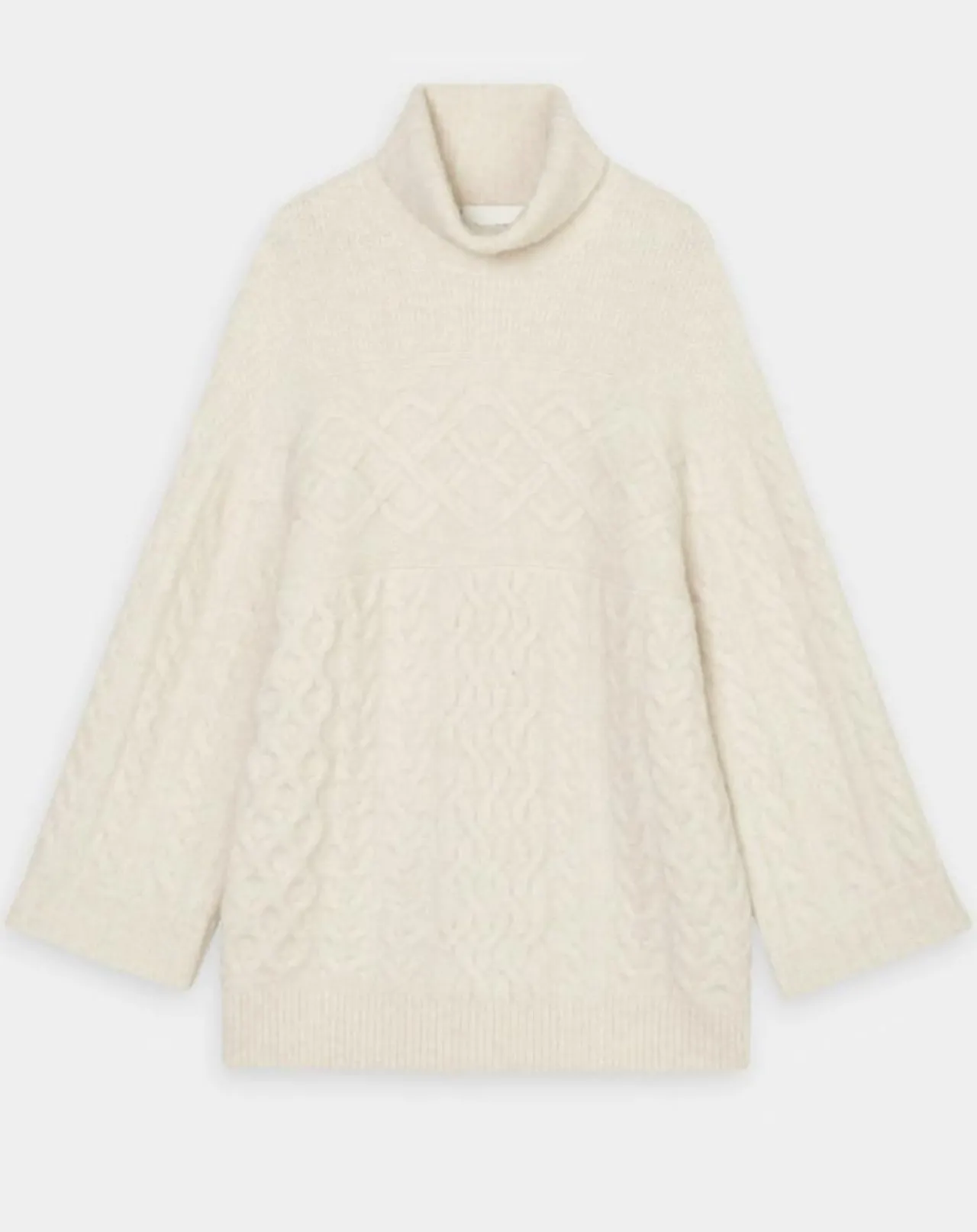 Toutes les directions – avec différents motifs de motifs torsadés distinctifs et en laine vierge mélangée compacte et douillette à teneur en élasthanne : le pull-over en maille oversize très décontracté à col roulé.