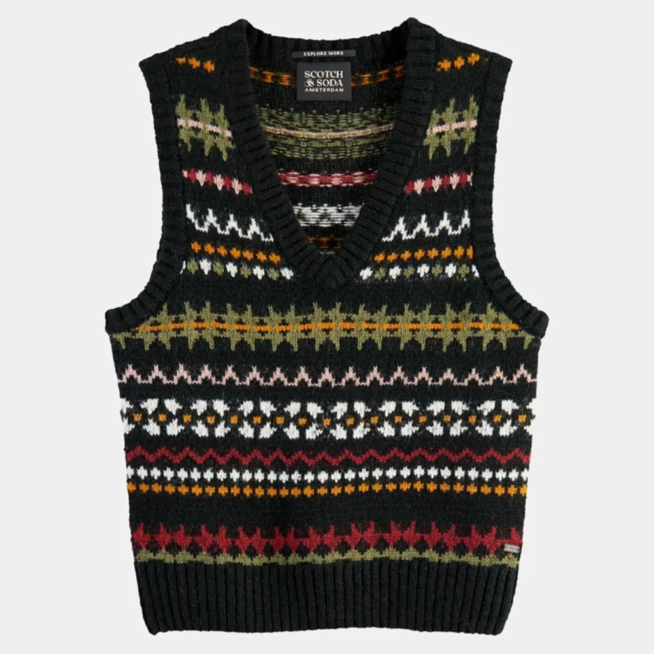 PullCe pull droit sans manches Scotch & Soda en maille jacquard fantaisie est muni d’un col V et de finitions côtelées