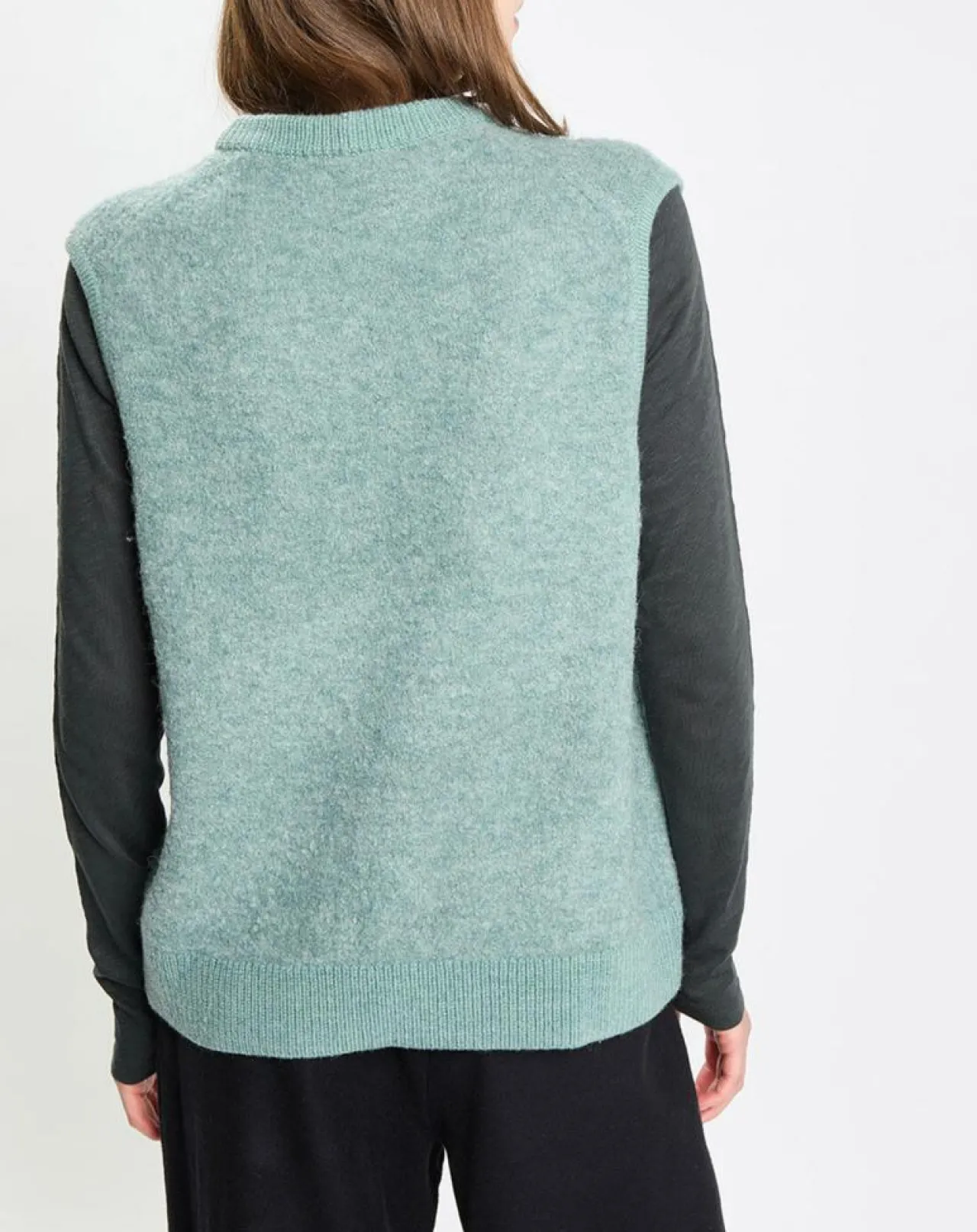 Ils font actuellement à nouveau leur retour et sont résolument tendance et contemporains : les pulls sans manches ! Modèle court ultra-décontracté en maille bouclette de laine vierge mélangée à de la laine d’alpaga, de coupe Slim Fit féminine.