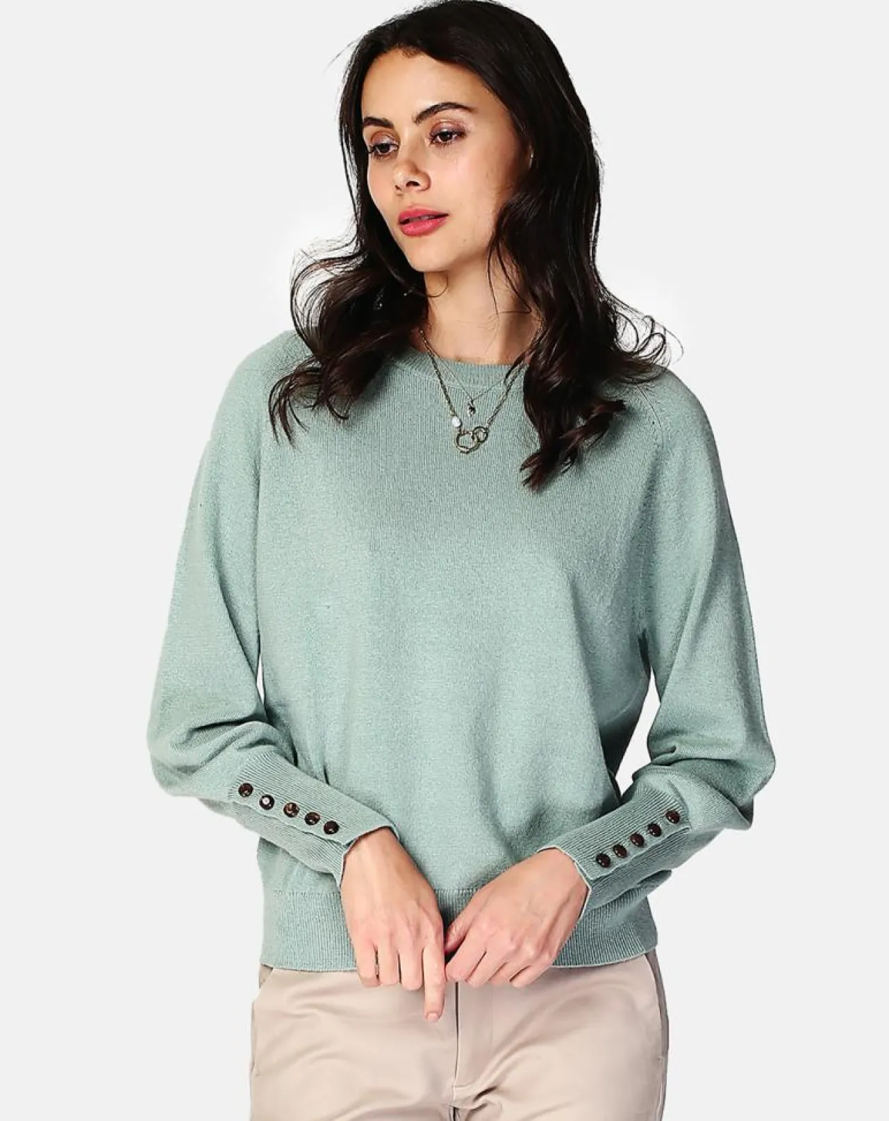 Pull large encolure ronde à manches longues légèrement ballon avec patte de boutonnage en bas de manche