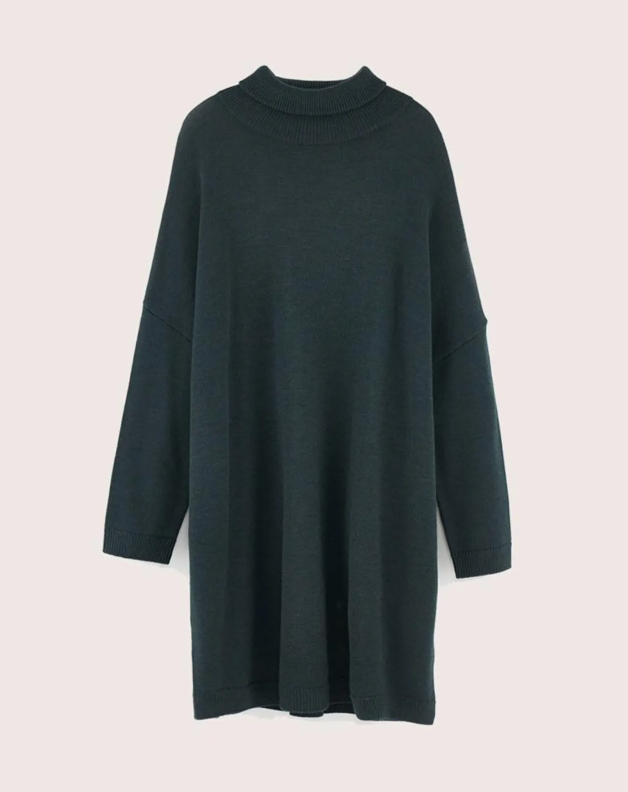 Robe pull oversize en mérinos extra fin couleur vert bouteille, col roulé en maille côtelée tricoté double