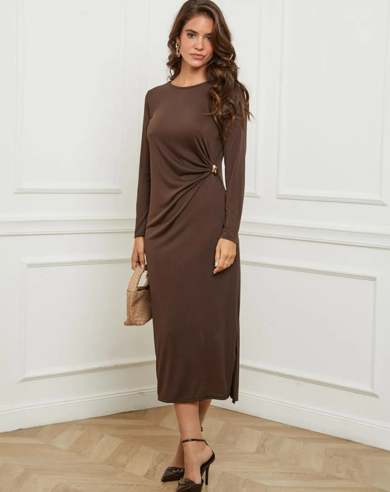 Robe longue, col rond manches longues, détail bijou au niveau de la taille