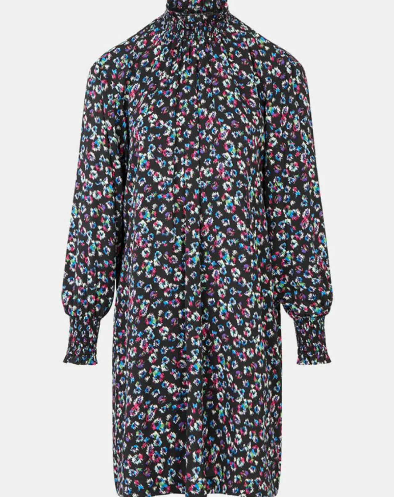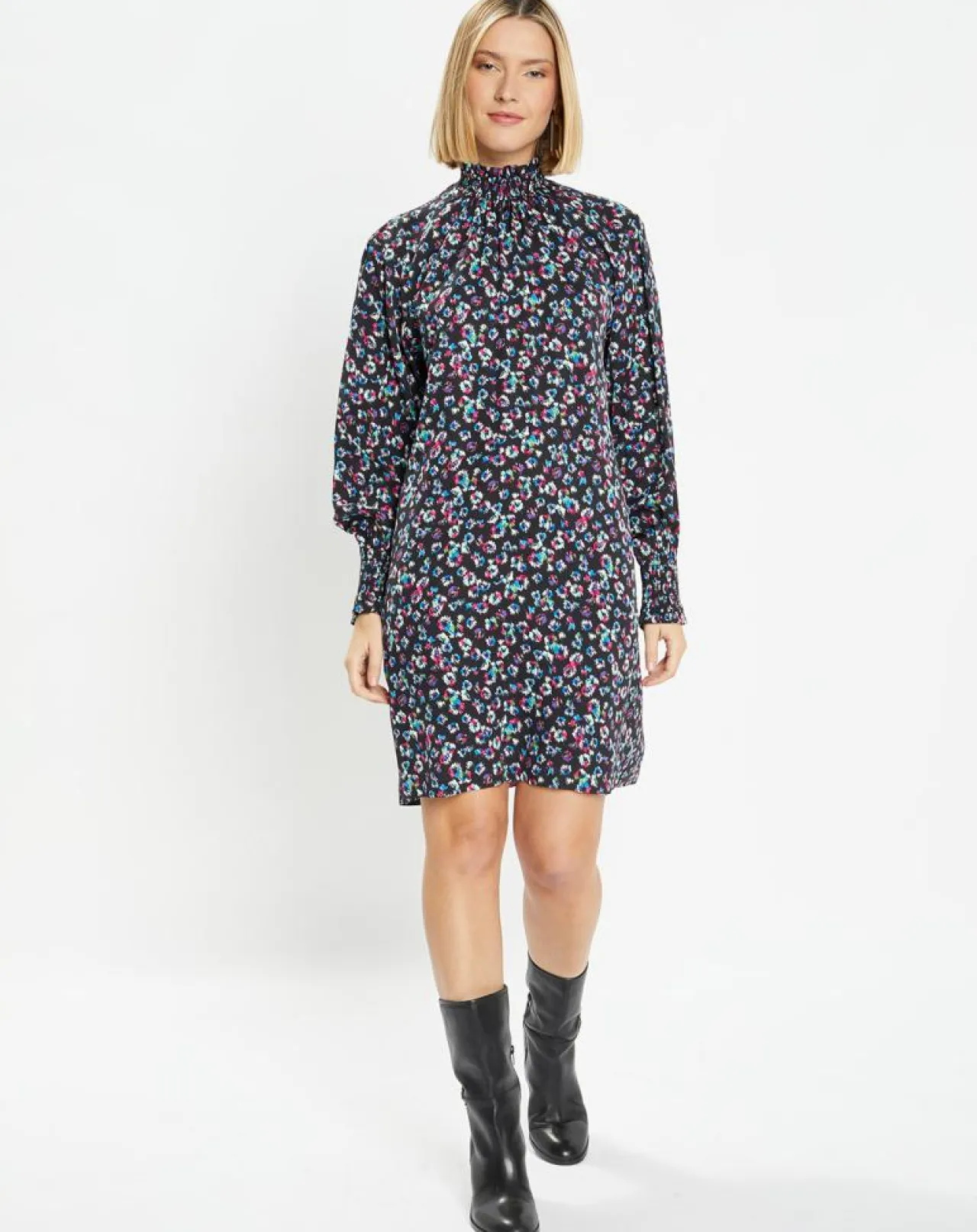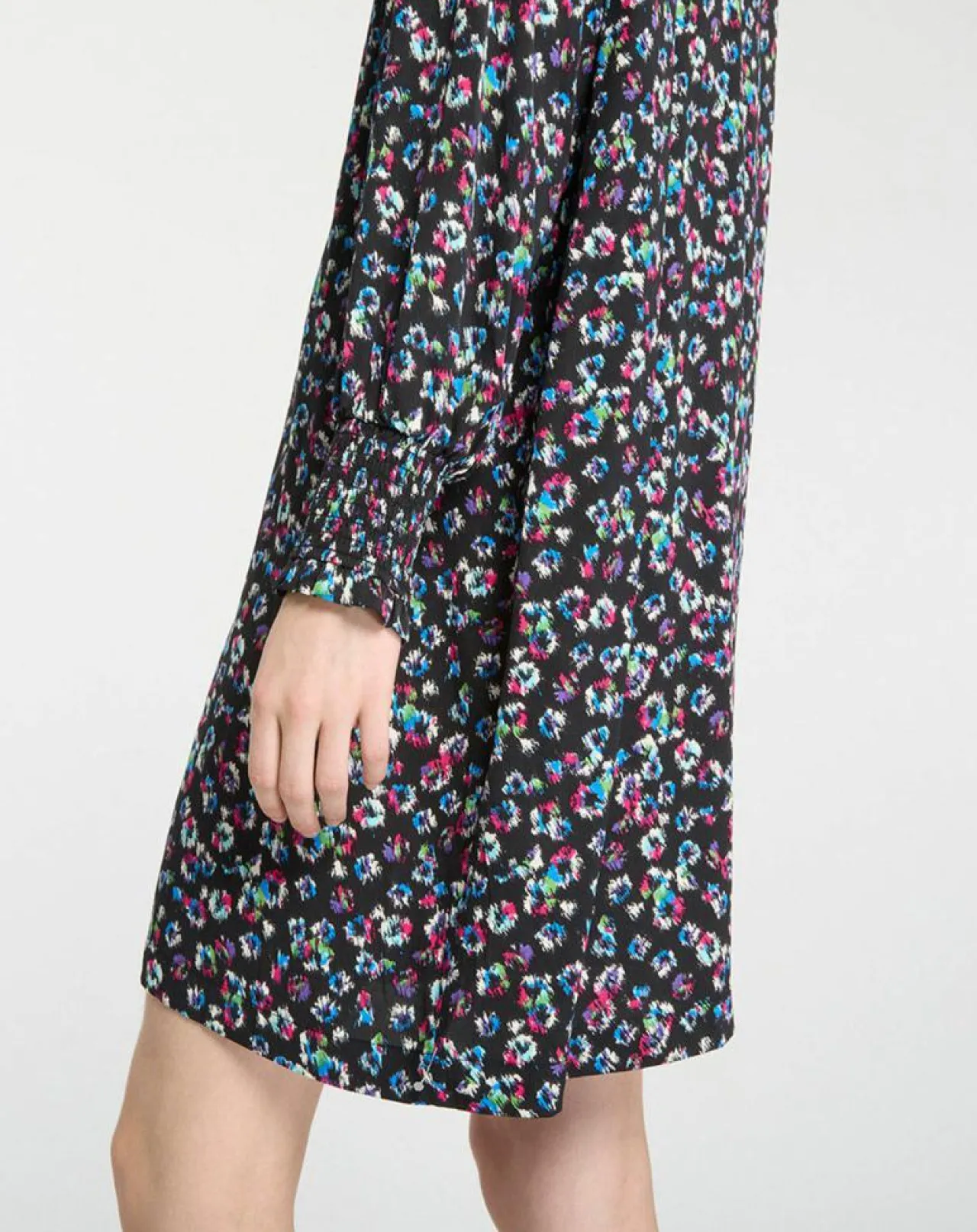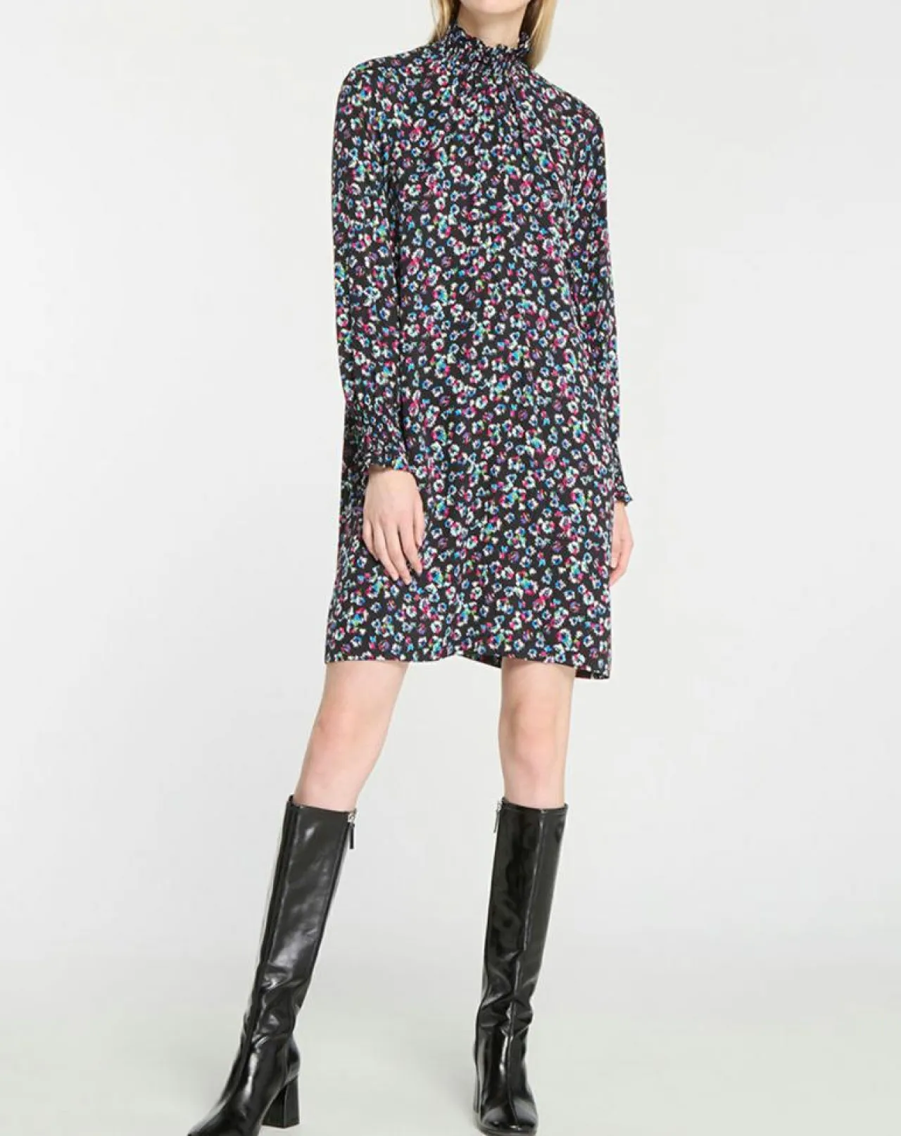 Cette robe courte et droite Galeries Lafayette est munie d’un imprimé fantaisie, d’un col montant à smocks boutonné sur la nuque et rehaussant une fente goutte d’eau et de manches longues.
