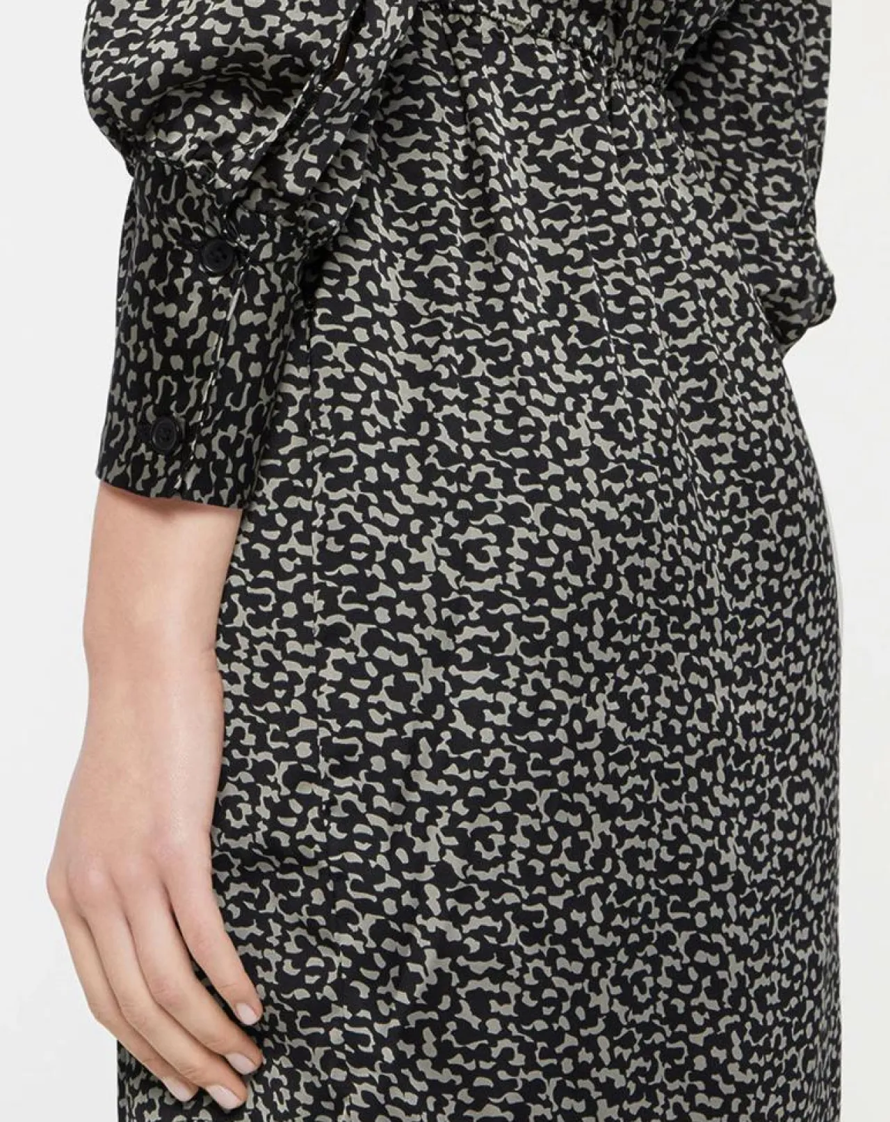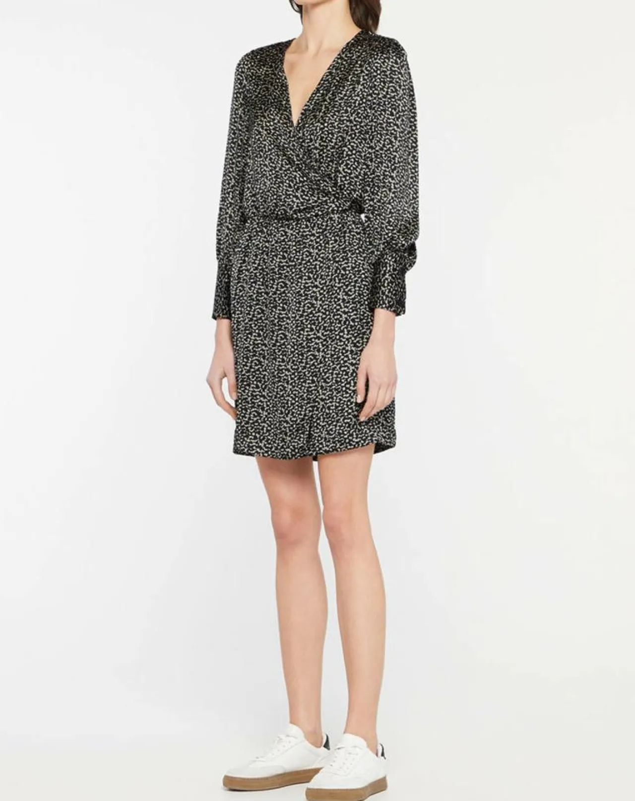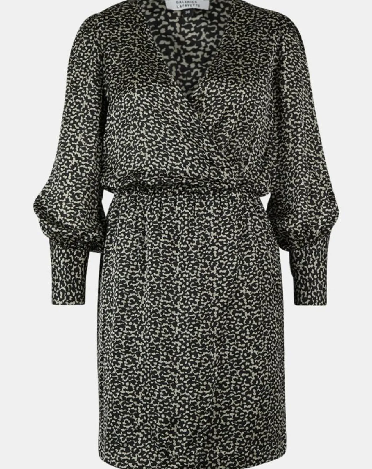Cette robe portefeuille courte et fluide Galeries Lafayette présente un imprimé fantaisie, un décolleté croisé, une taille élastiquée, des manches longues et une doublure.