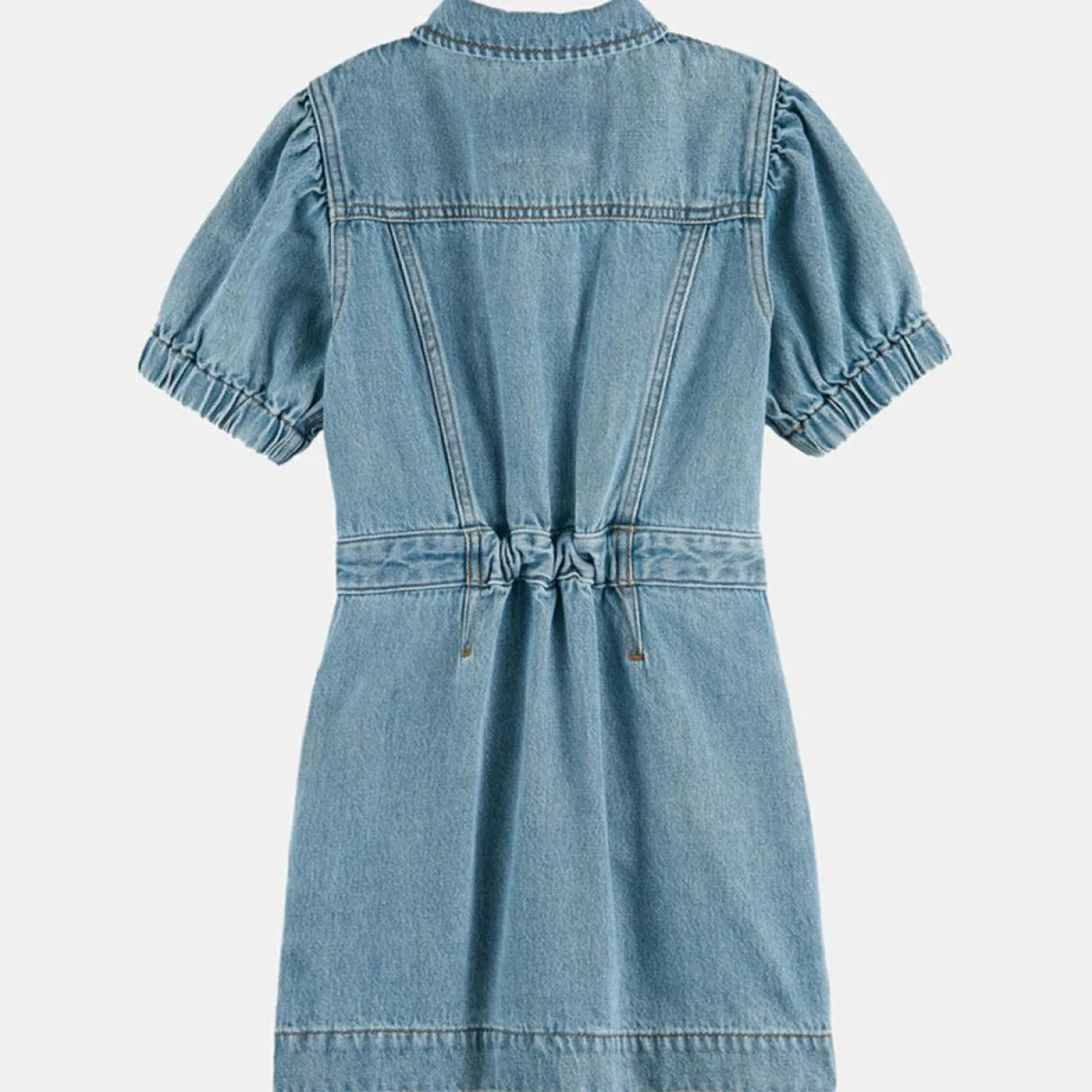 Cette robe ajustée et courte Scotch & Soda composée de coton présente un col classique, une fermeture boutonnée, des manches courtes ballons et des poches cavalières sur le devant.