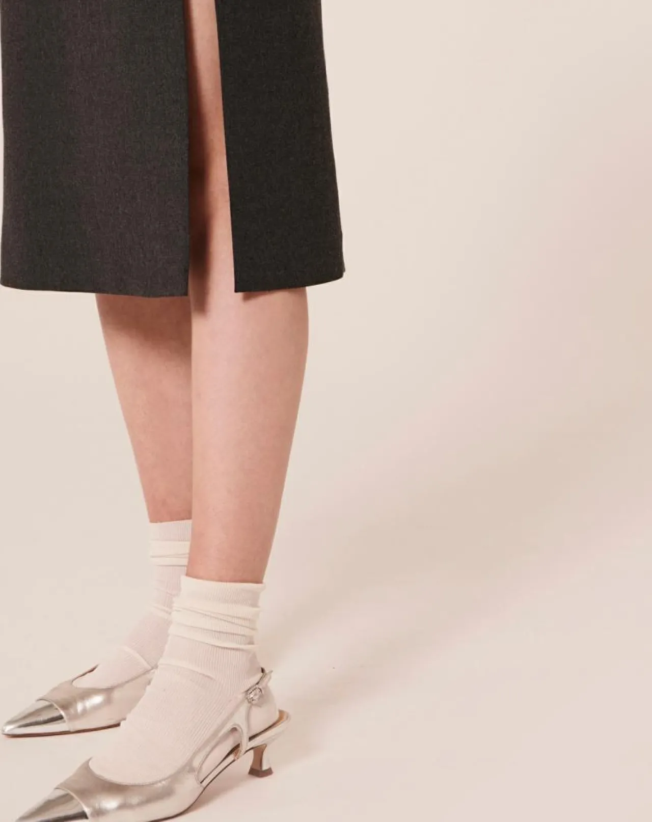 Sa coupe droite mi-longue est marquée à la taille et une fente au côté gauche laisse découvrir la jambe