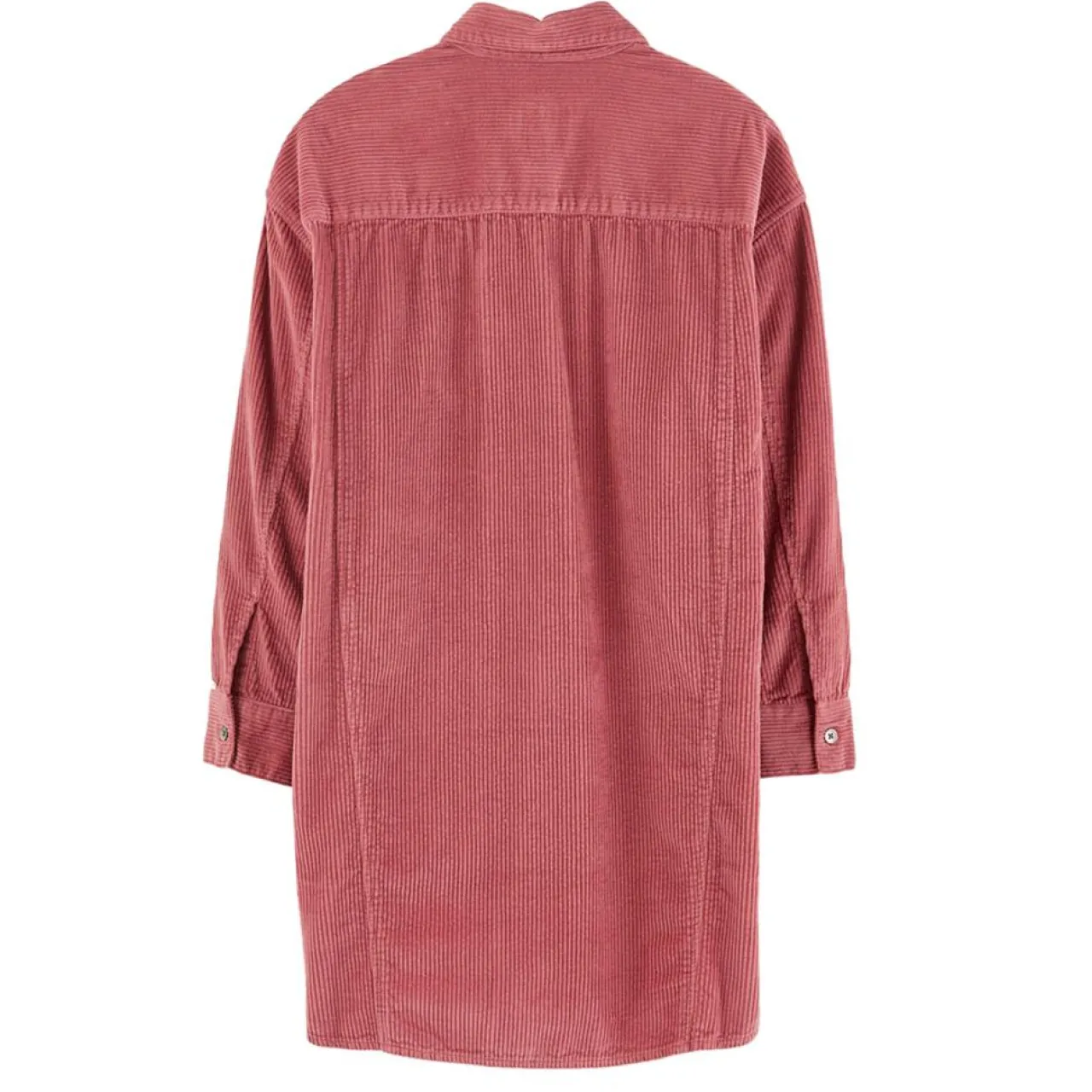Robe courte, style chemise, en velours de coton côtelé couleur bordeaux, manches longues ajustées et col de chemise