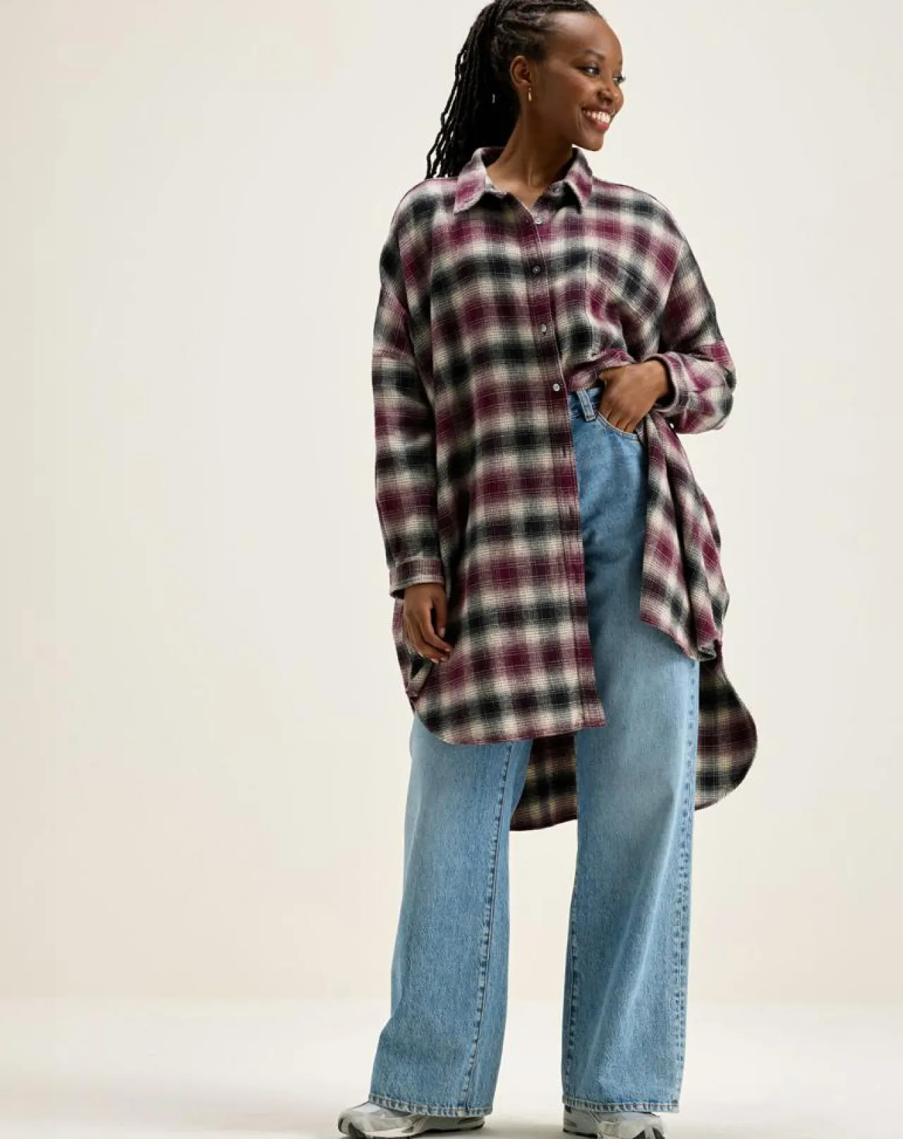 Robe chemise à manches longues, coupe oversize fabriquée en coton brossé à carreaux rouges, noirs et écrus