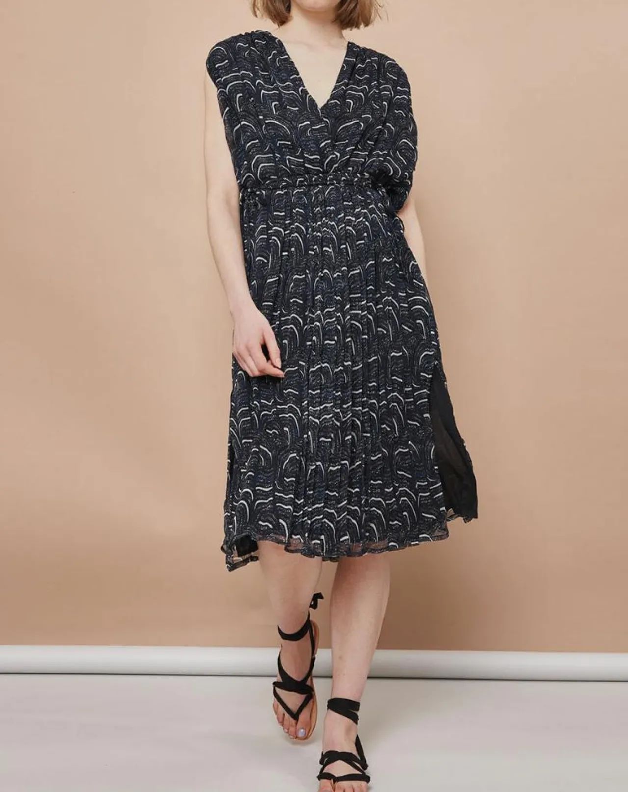 Elle est confectionnée dans une mousseline imprimée du motifvaguetrès seventies