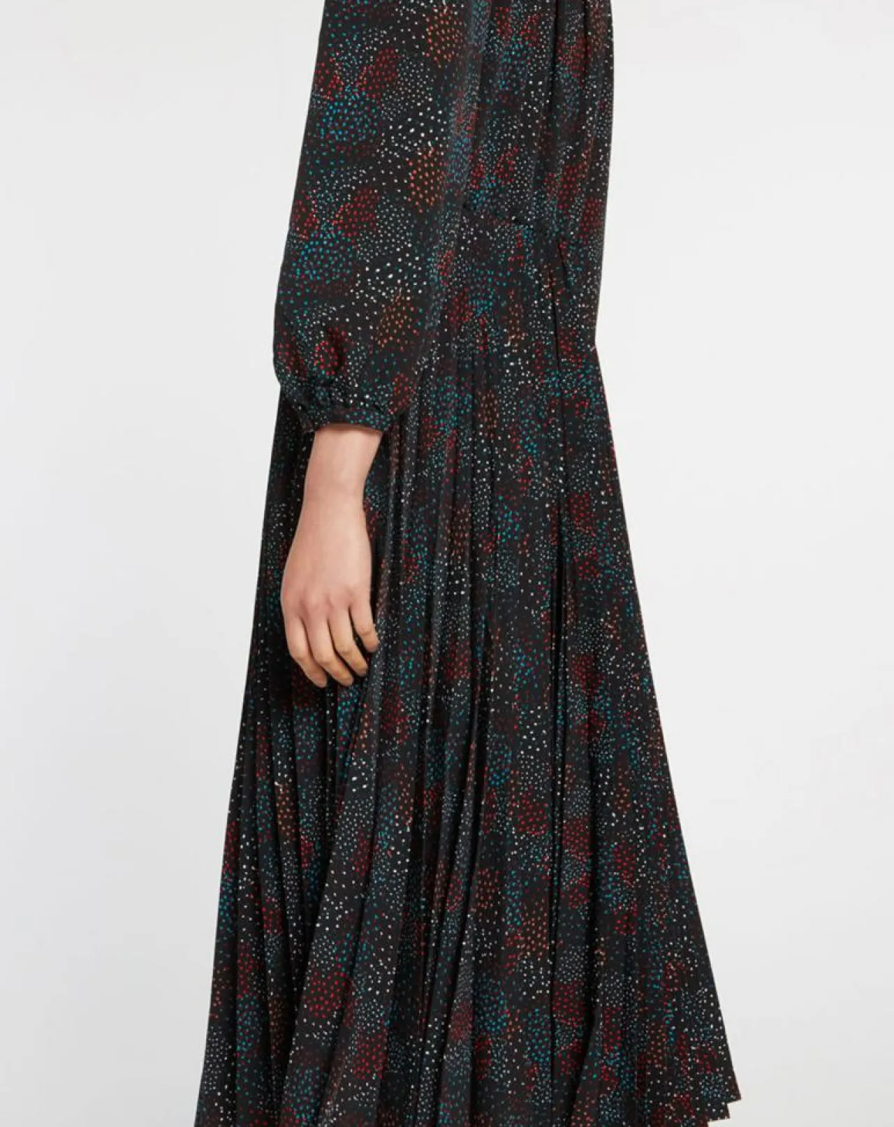 Cette robe longue fluide plissée Galeries Lafayette présente un imprimé moucheté, des manches longues, un col rond avant et en V au dos avec liens de maintien à nouer et une taille marquée élastiquée.