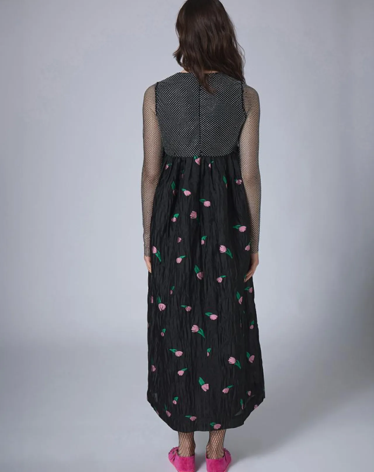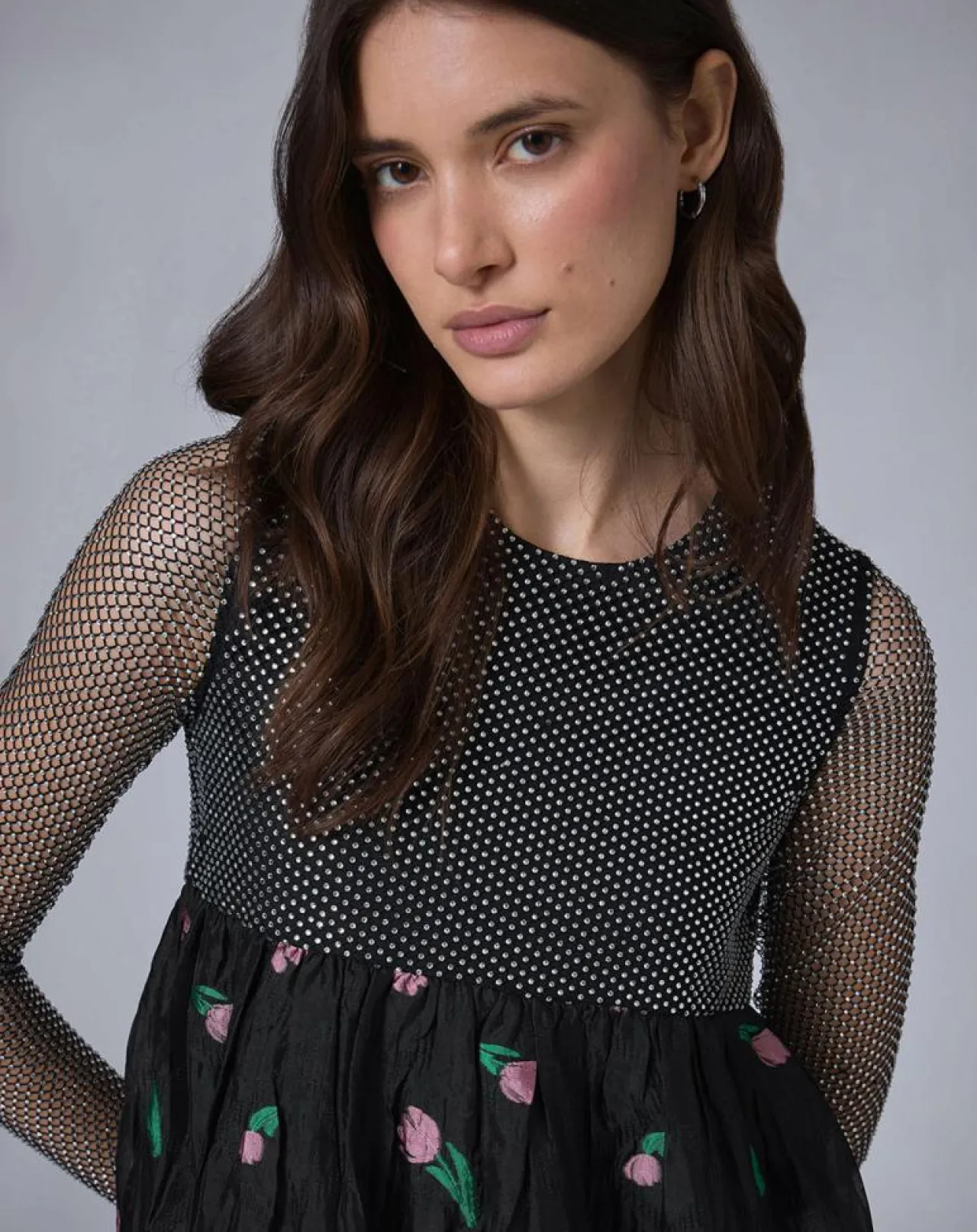Résille à strass sur le haut, tissu géométrique et fleurs tissées sur le bas