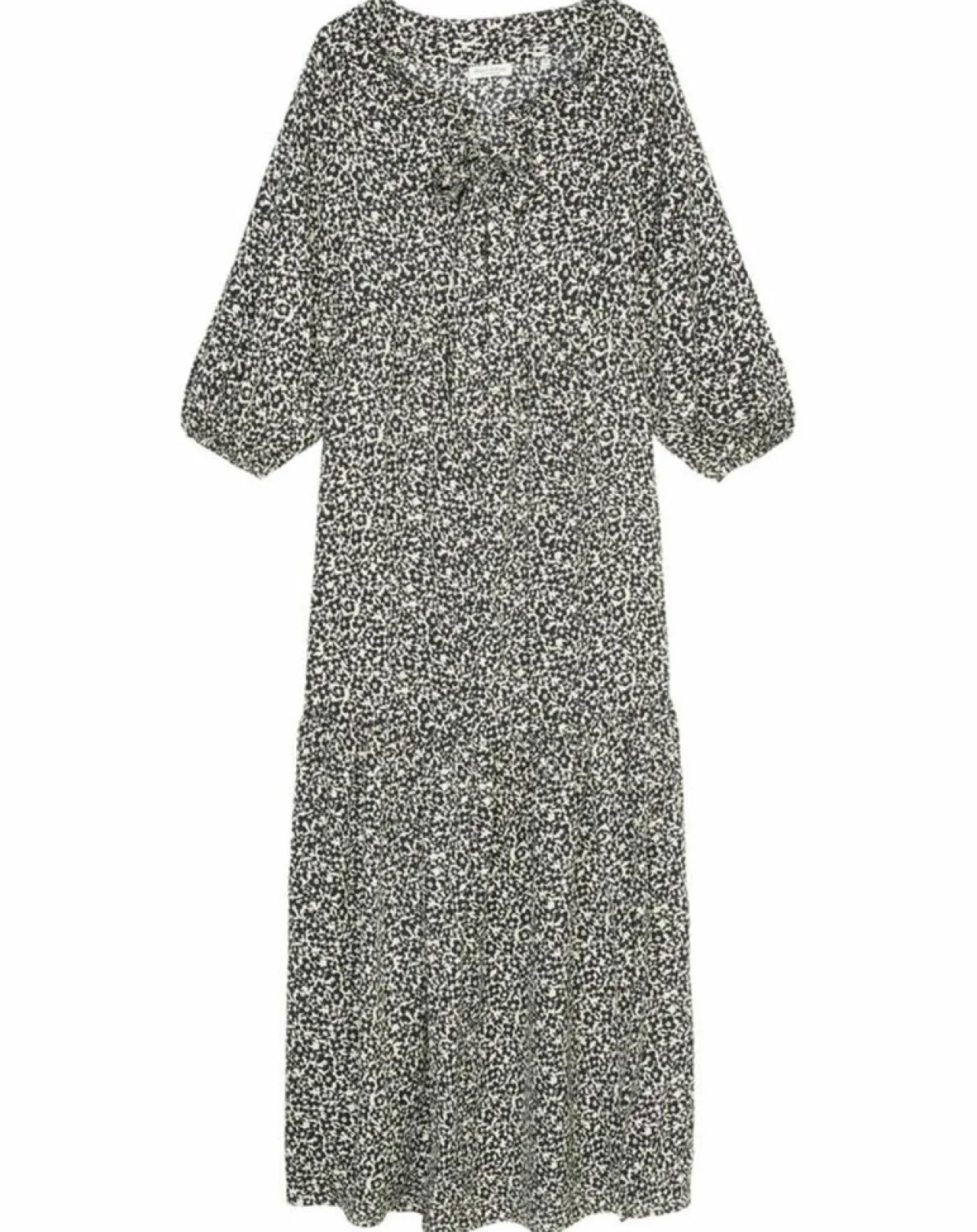 De style bohème féminin aux accents rétro des années 70, cette maxi-robe à volants finement imprimée est confectionnée en pur twill de viscose fluide.