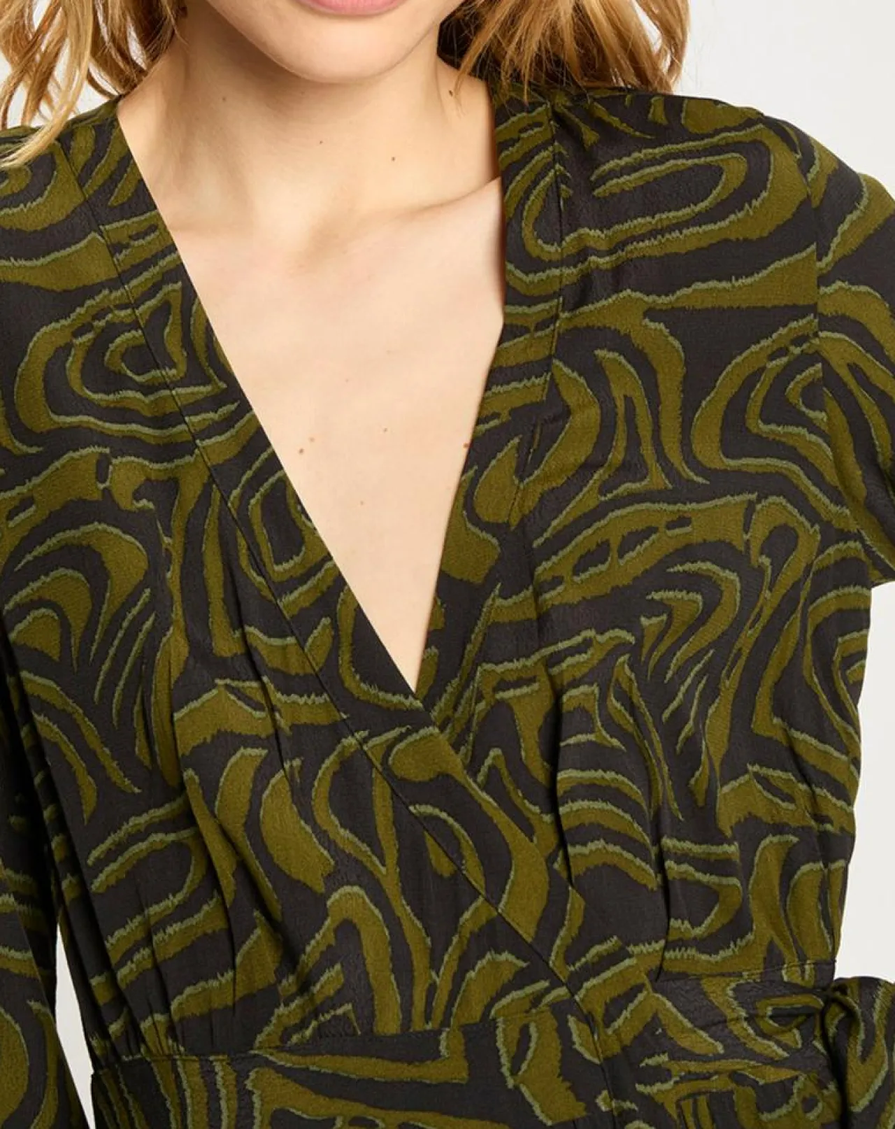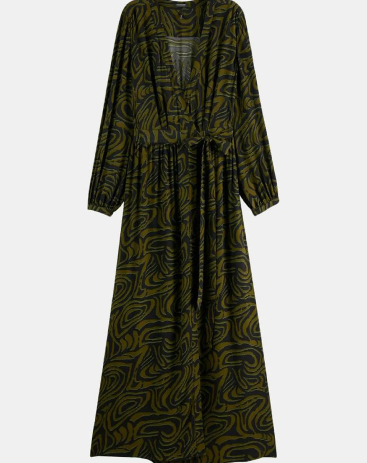 Cette robe portefeuille longue fluide Scotch&Soda à imprimé fantaisie est munie d’un col V, de manches longues, d’une ceinture à nouer et de poignets resserrés.