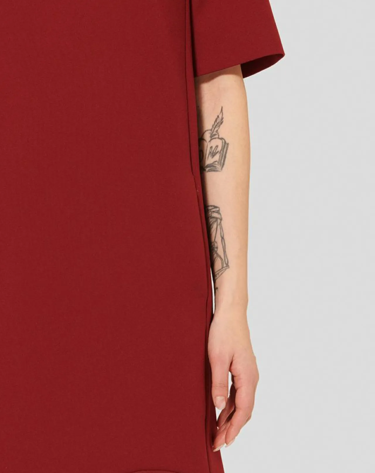 Cette courte robe bordeaux en toile double possède un petit col montant et des manches courtes
