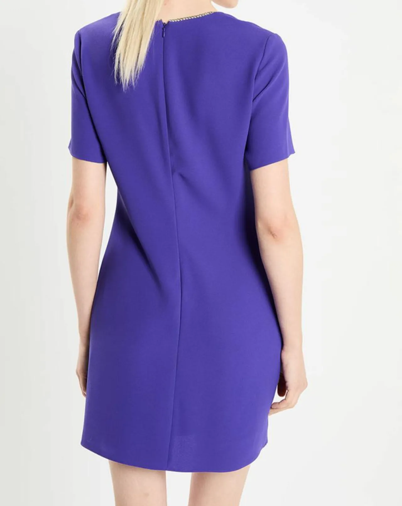 La robe courte RESA à la coupe ajustée est réhaussée d’un col bijoux et d’un plis central au dos