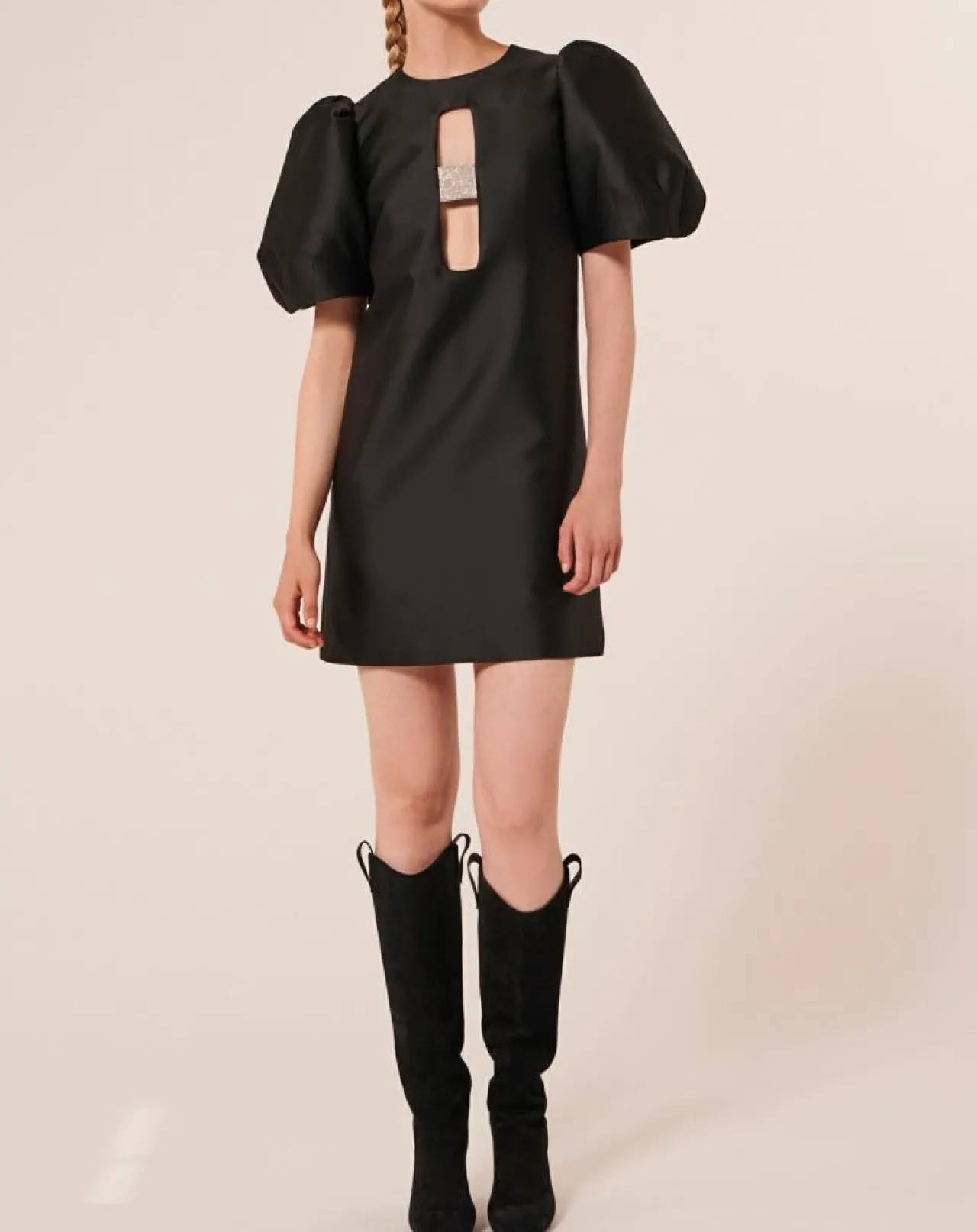 Notre robe courte Rettel noire en satin duchesse possède une coupe droite, un col rond et de jolies manches courtes ballon XL