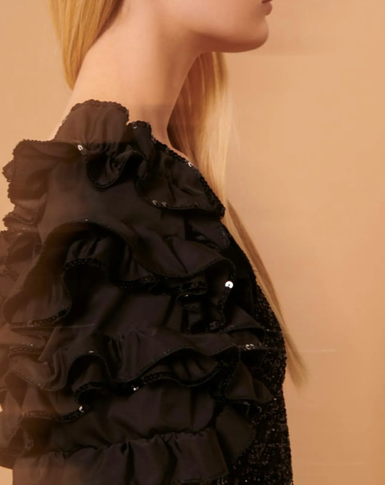 Cette robe courte noire scintillante possède une coupe près du corps, un col V plongeant ultra élégant et des manches courtes ballon à volantes aux brodures pailletées