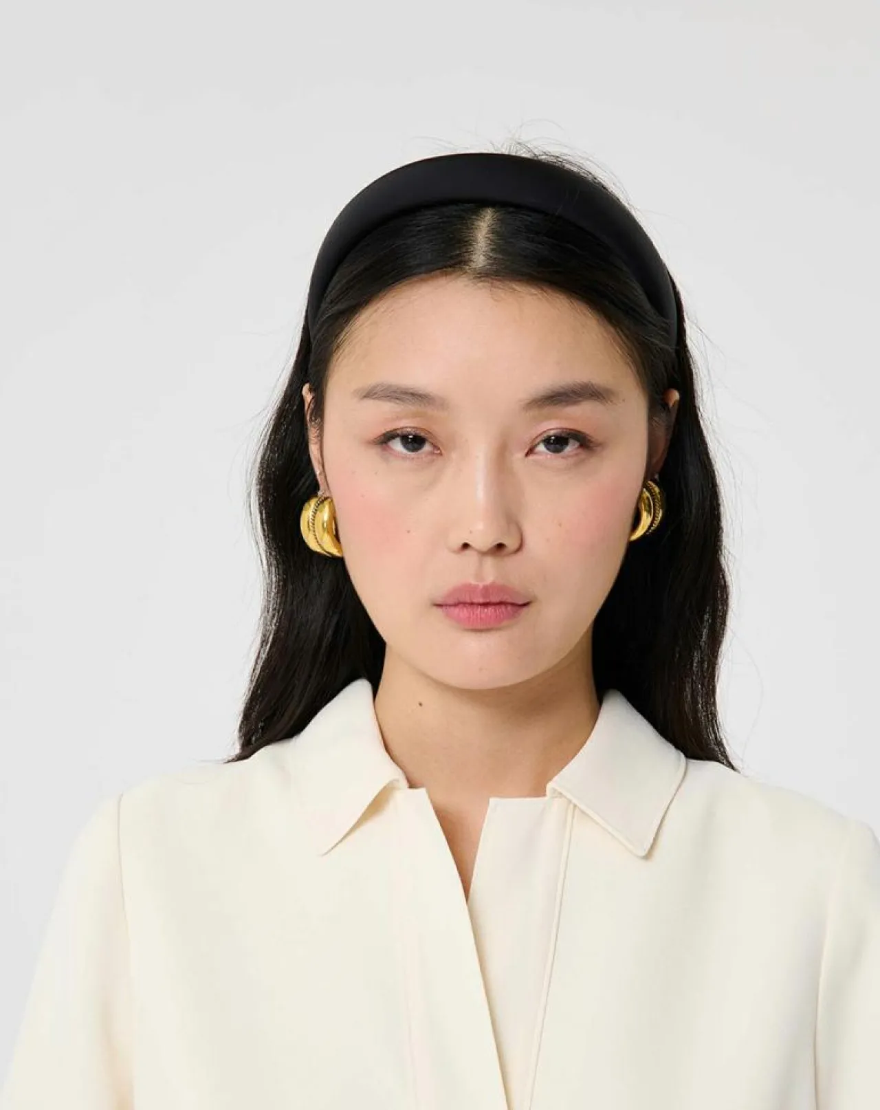 Cette courte robe écrue en crêpe possède une coupe légèrement évasée, des manches courtes, ainsi qu’un col chemise et une encolure en V.