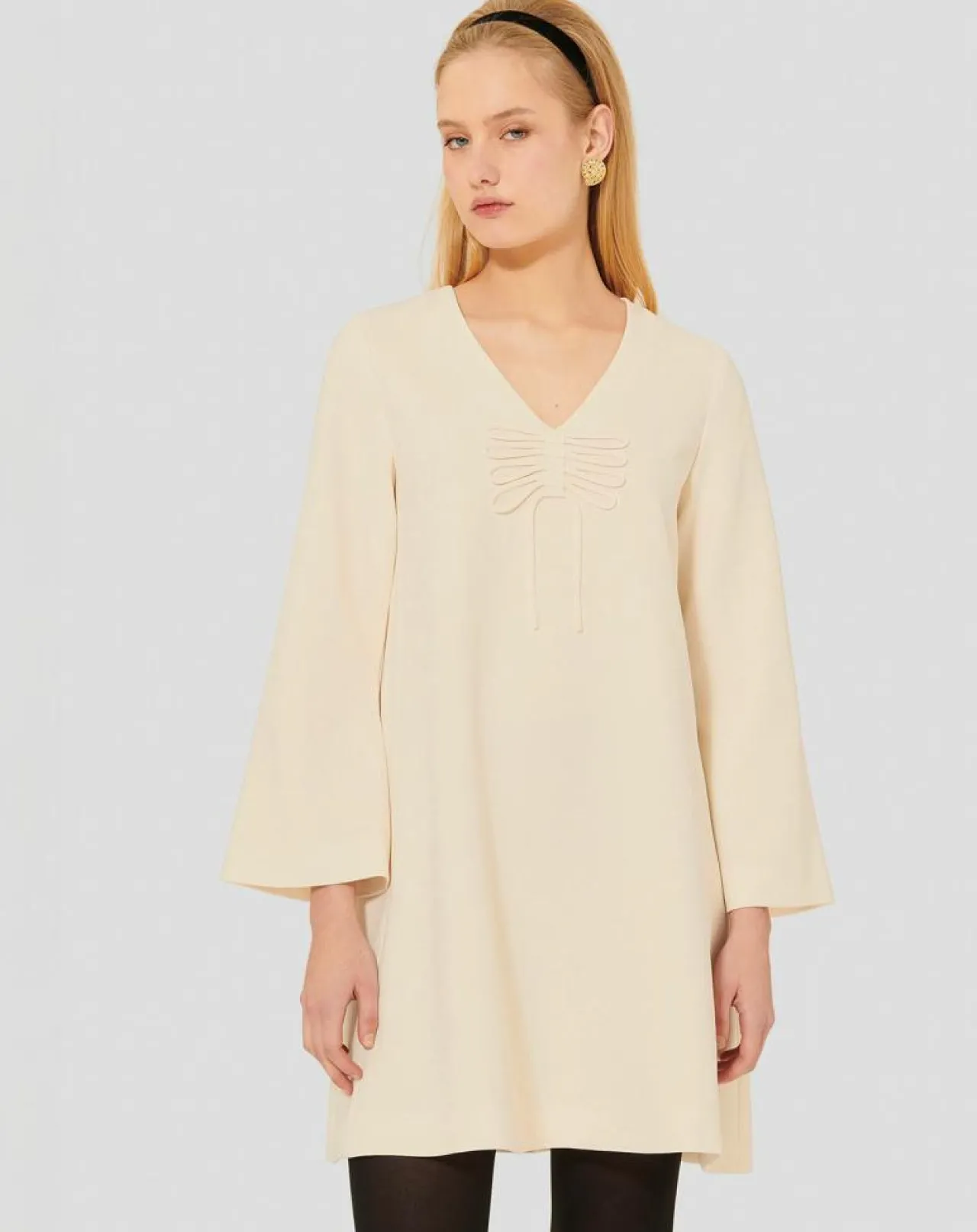 Cette robe écrue en crêpe possède une coupe droite, un col V et des manches longues et larges