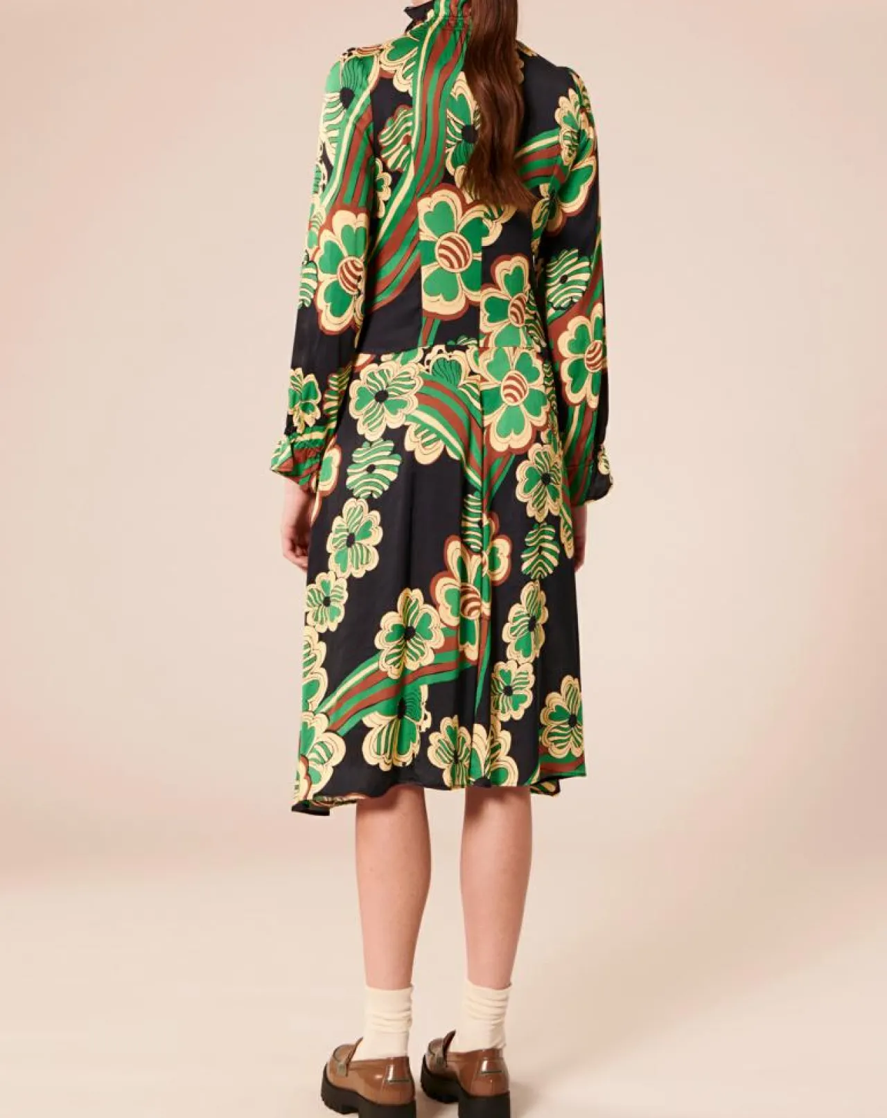 Cette robe couleur bleu nocturne longue imprimée de grosses fleurs possède un col montant et des manches longues