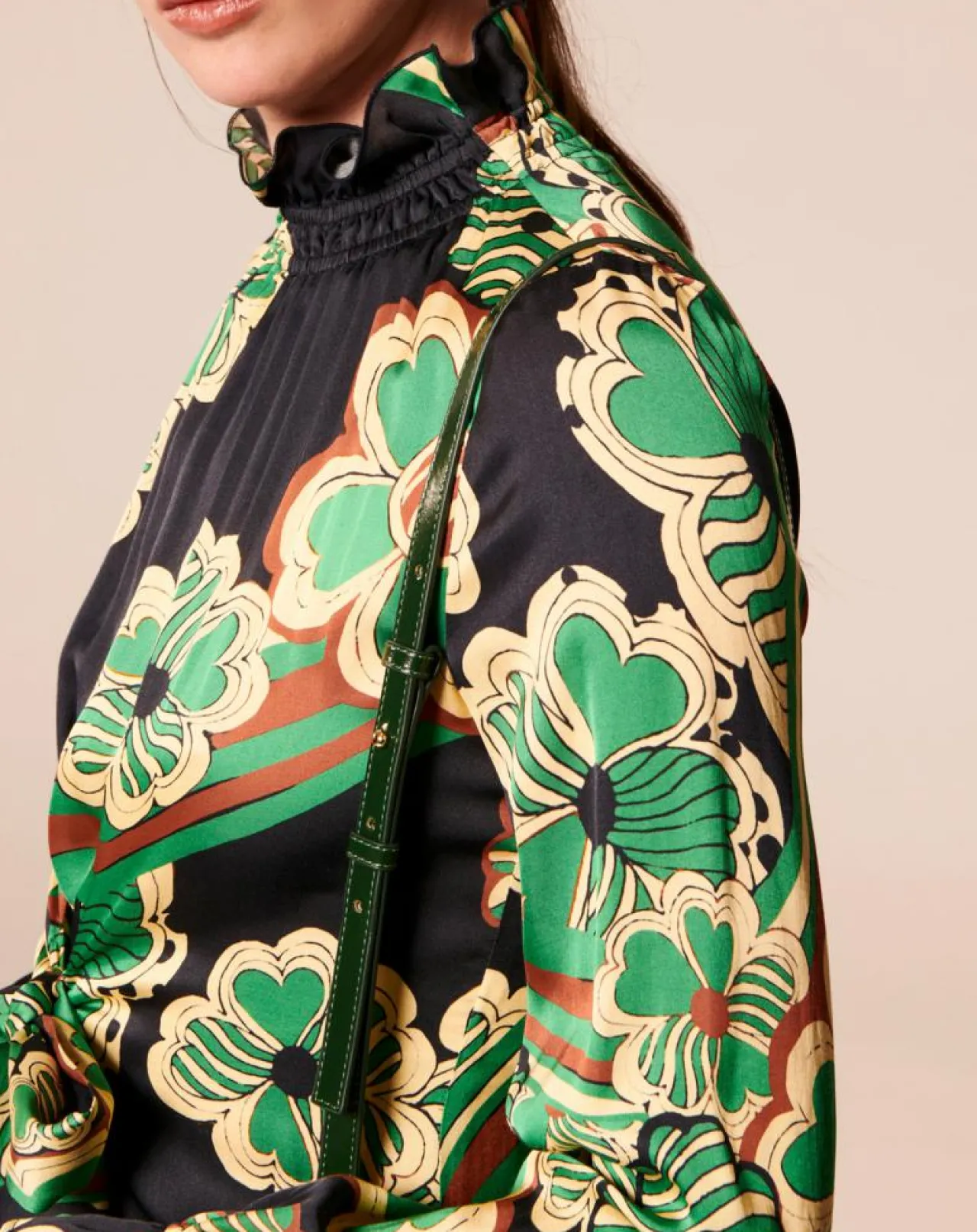 Confectionnée en matière satinée, elle est entièrement imprimée de notre motif Rainbow Flower pour une allure romantique et colorée