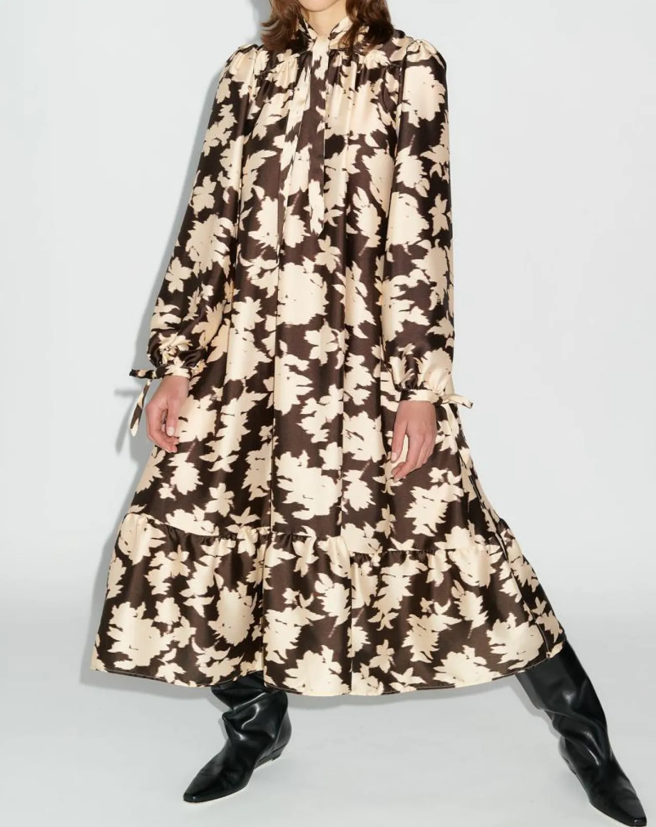 On adopte cette direction en optant pour un tissu fluide et large orné d’un imprimé beige et chocolat