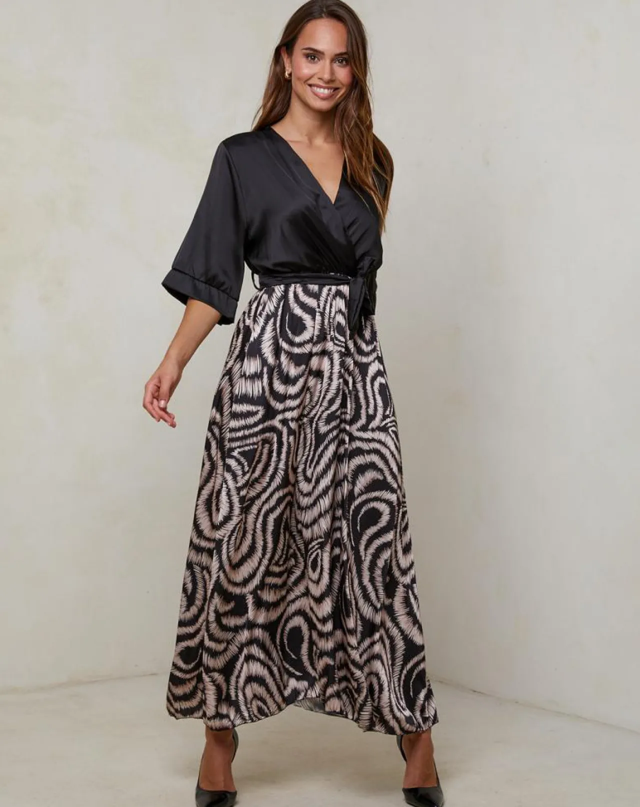 Robe longue col V manches trois quart avec motifs sur le bas ceinture à la taille