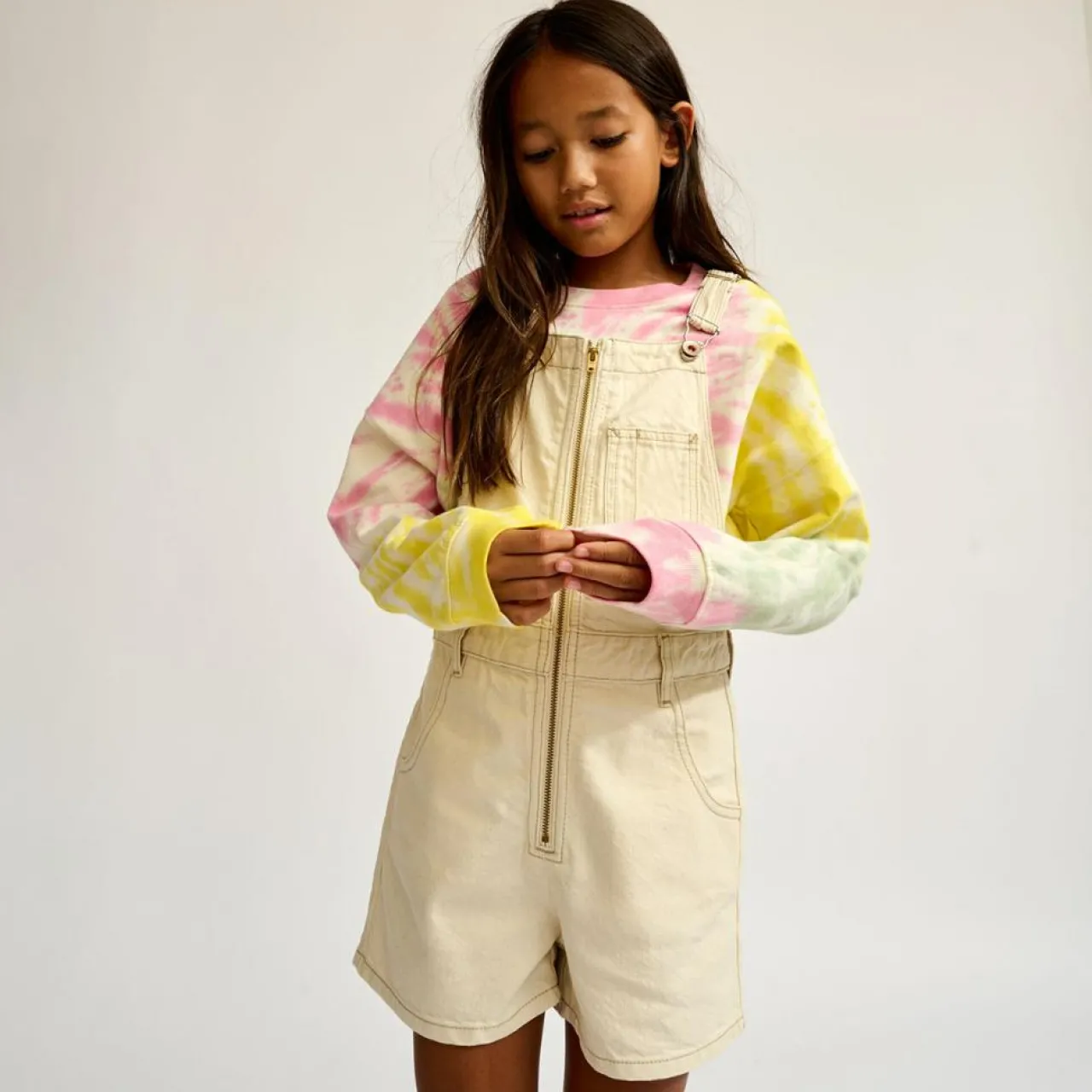 Confectionnée en coton et Lyocell mélangés, cette salopette blanc cassé présente un mini short, des bretelles réglables et un zip super pratique à l’avant qui permet de l’ouvrir et la refermer en un seul geste