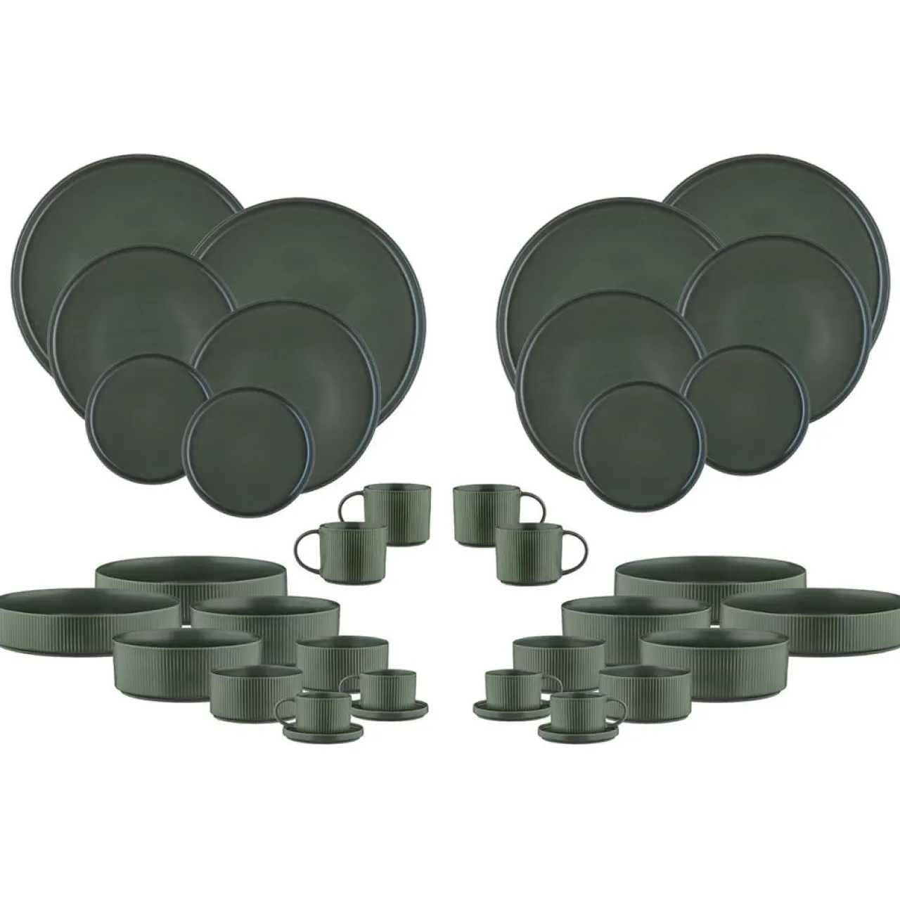 – Contient : 4 assiettes Ø27.5cm + 4 assiettes Ø21.5cm + 4 assiettes Ø16.5cm + 4 assiettes creuses Ø21.5cm + 4 bols Ø12cm + 4 bols Ø16.5cm + 4 mugs 50cl + 4 tasses 15cl et 4 soucoupes Ø12cm