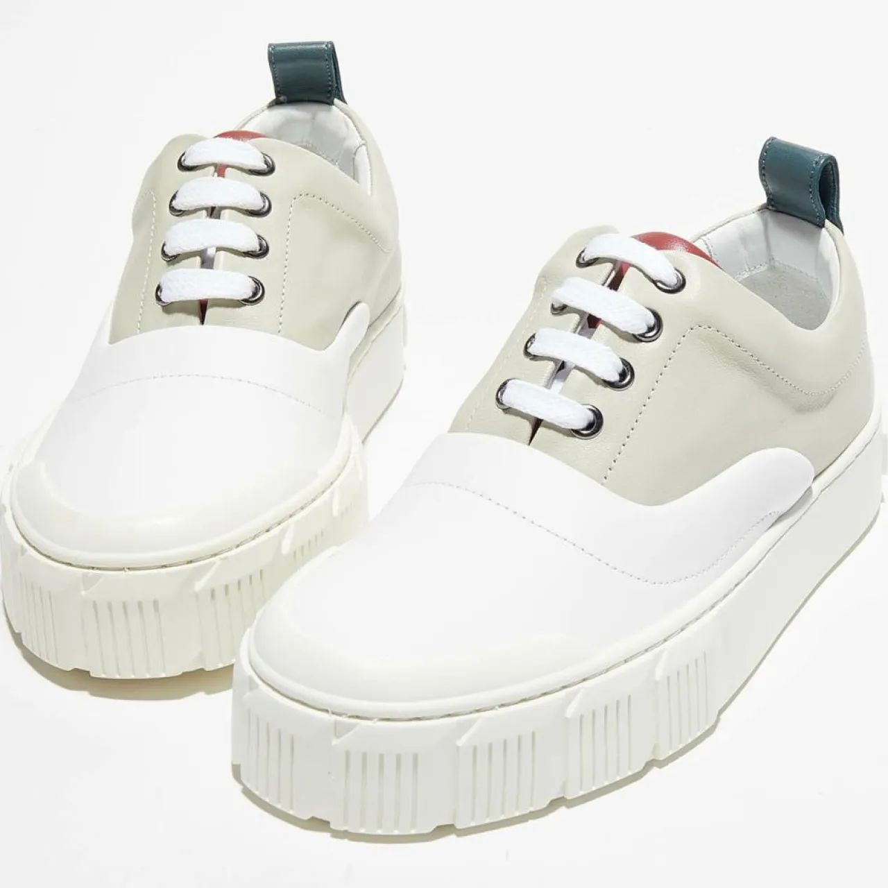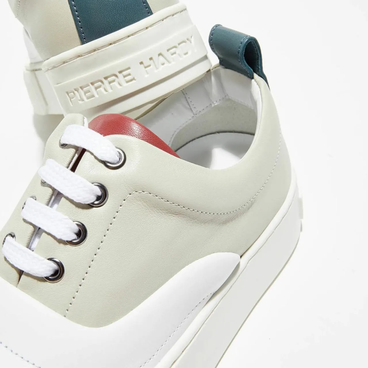 Ces baskets basses Pierre Hardy en cuir de vachette lisse, présentent un bout rond renforcé, un laçage à 4 oeillets, un tirant d’enfilage contrastant et la griffe embossée en ton sur ton à l’arrière.