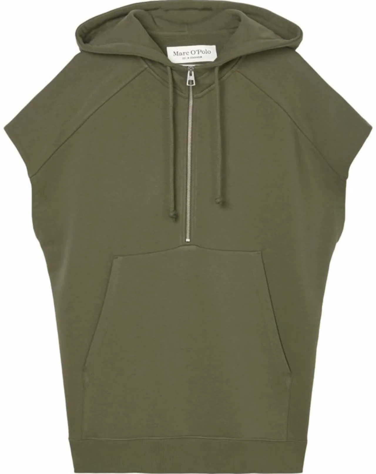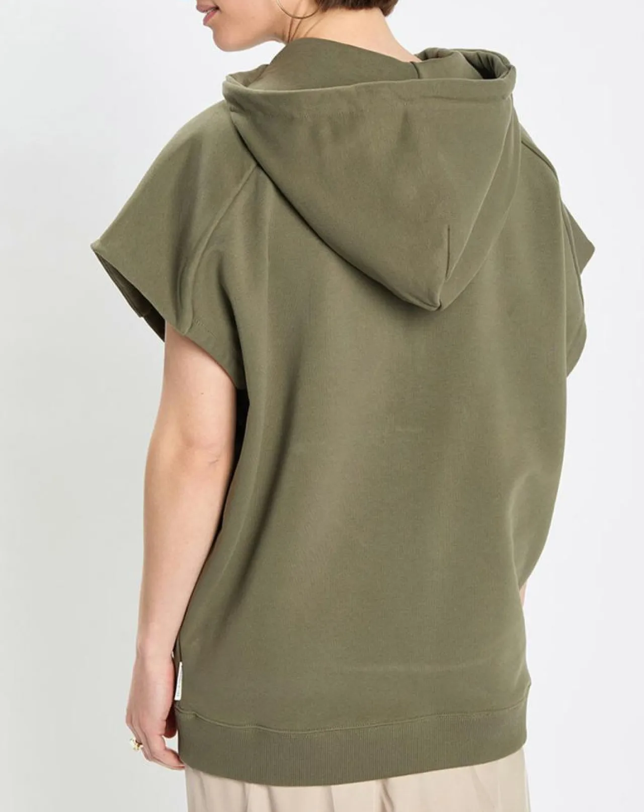 Le sweat à capuche zippé sans manches, de style cape, se superpose ou se porte en solo à même la peau, de manière décontractée.