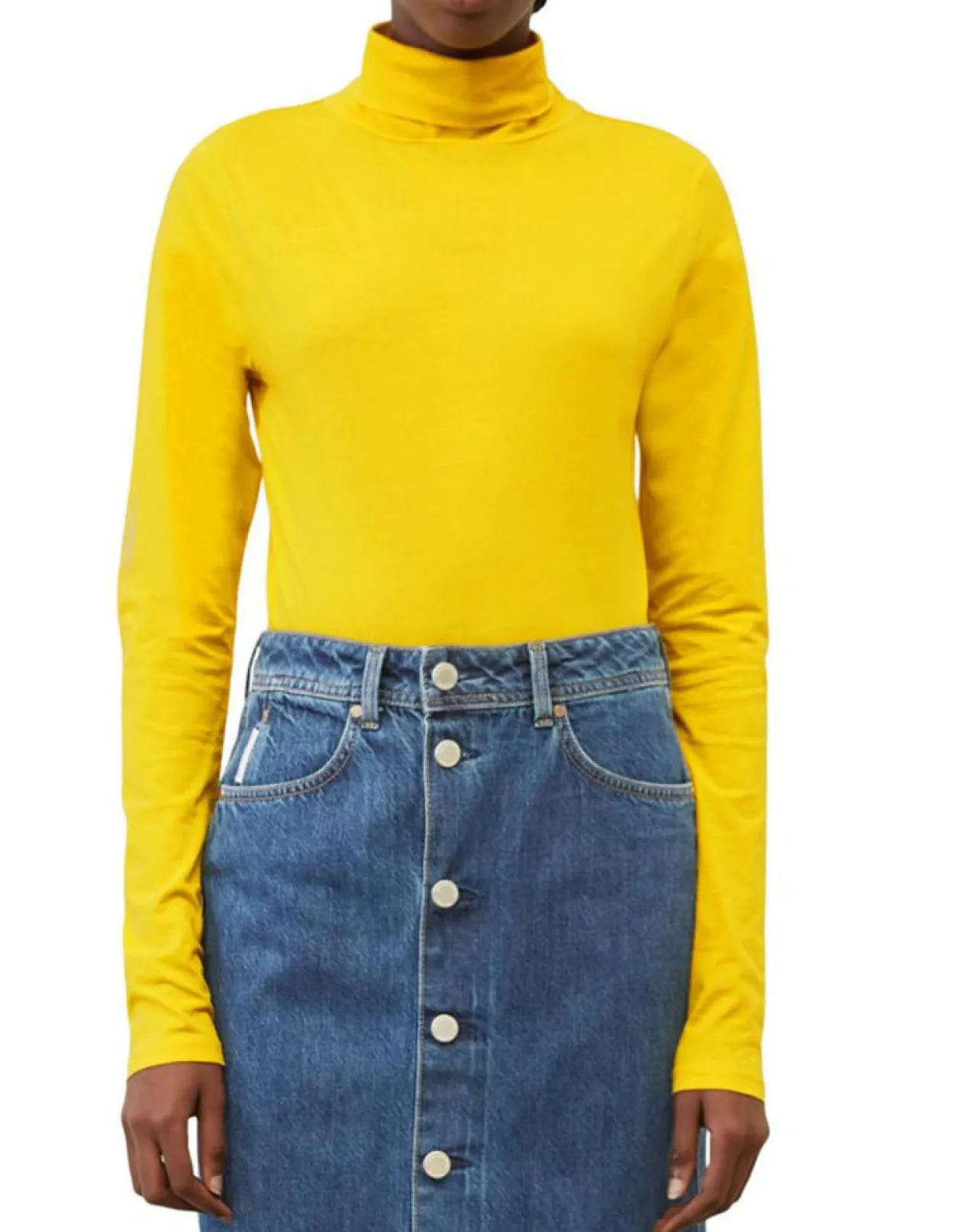 Modèle féminin classique et d’allure sportive : le col roulé doux à manches longues en jersey de pur coton biologique haut de gamme.