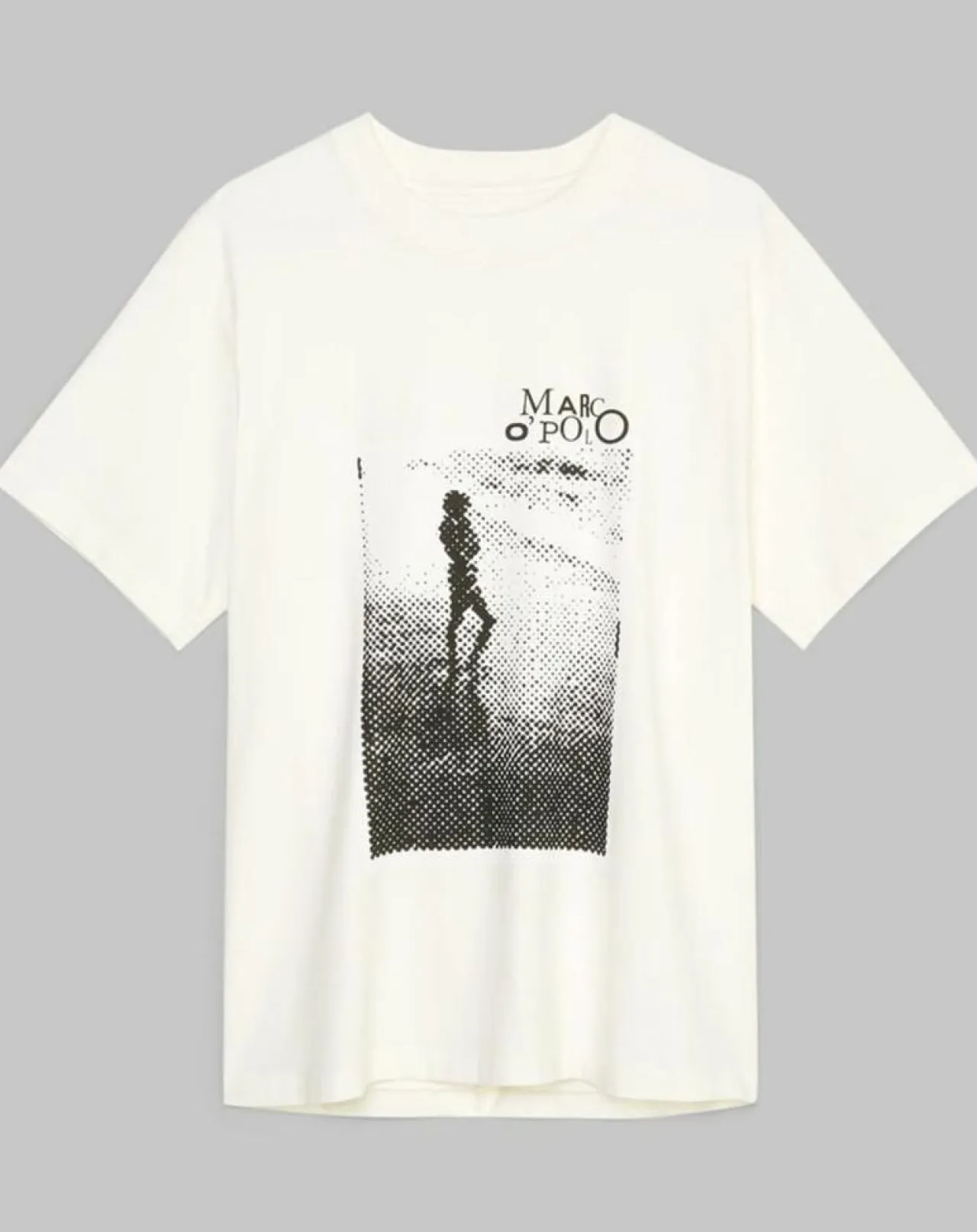 Ce modèle en pur coton biologique certifié présente une coupe évasée décontractée dotée d’une encolure ronde, de manches courtes et d’un motif original imprimé sur le devant.