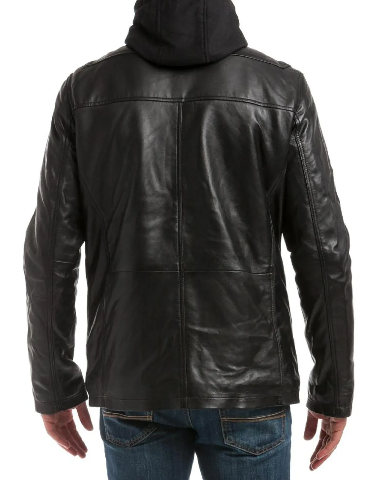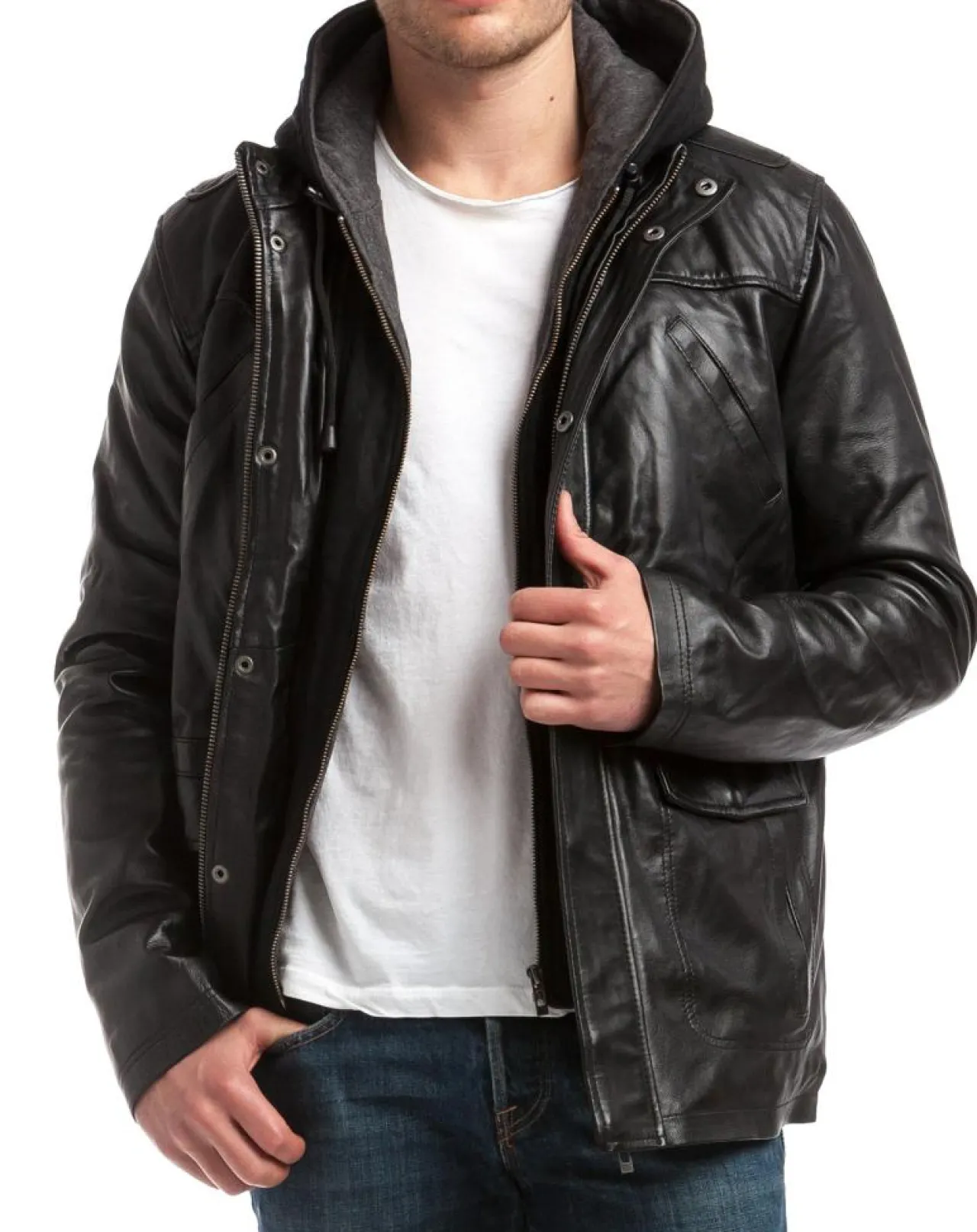Veste en cuir mi-longue de type parka avec 2 poches poitrine et 2 poches latérales
