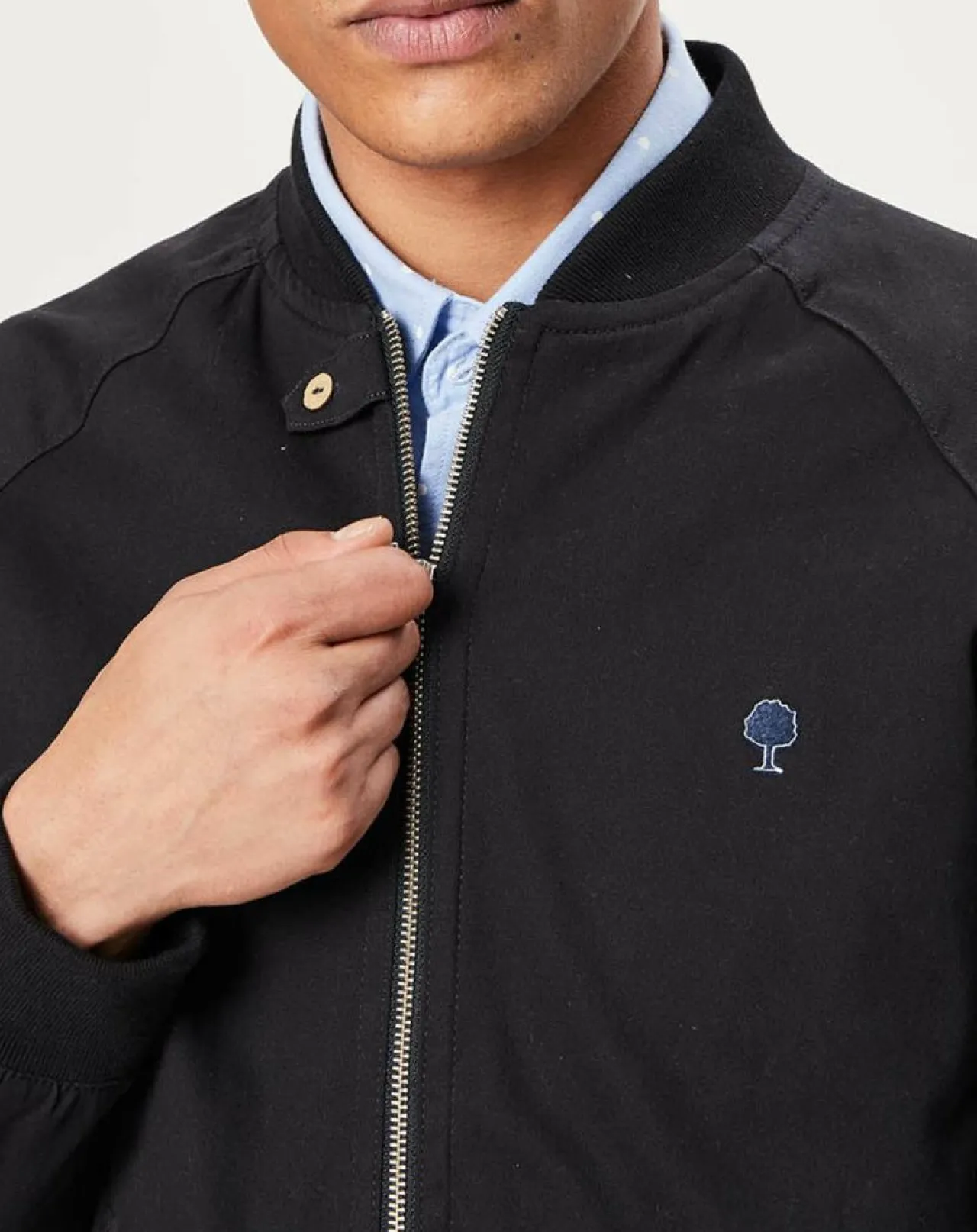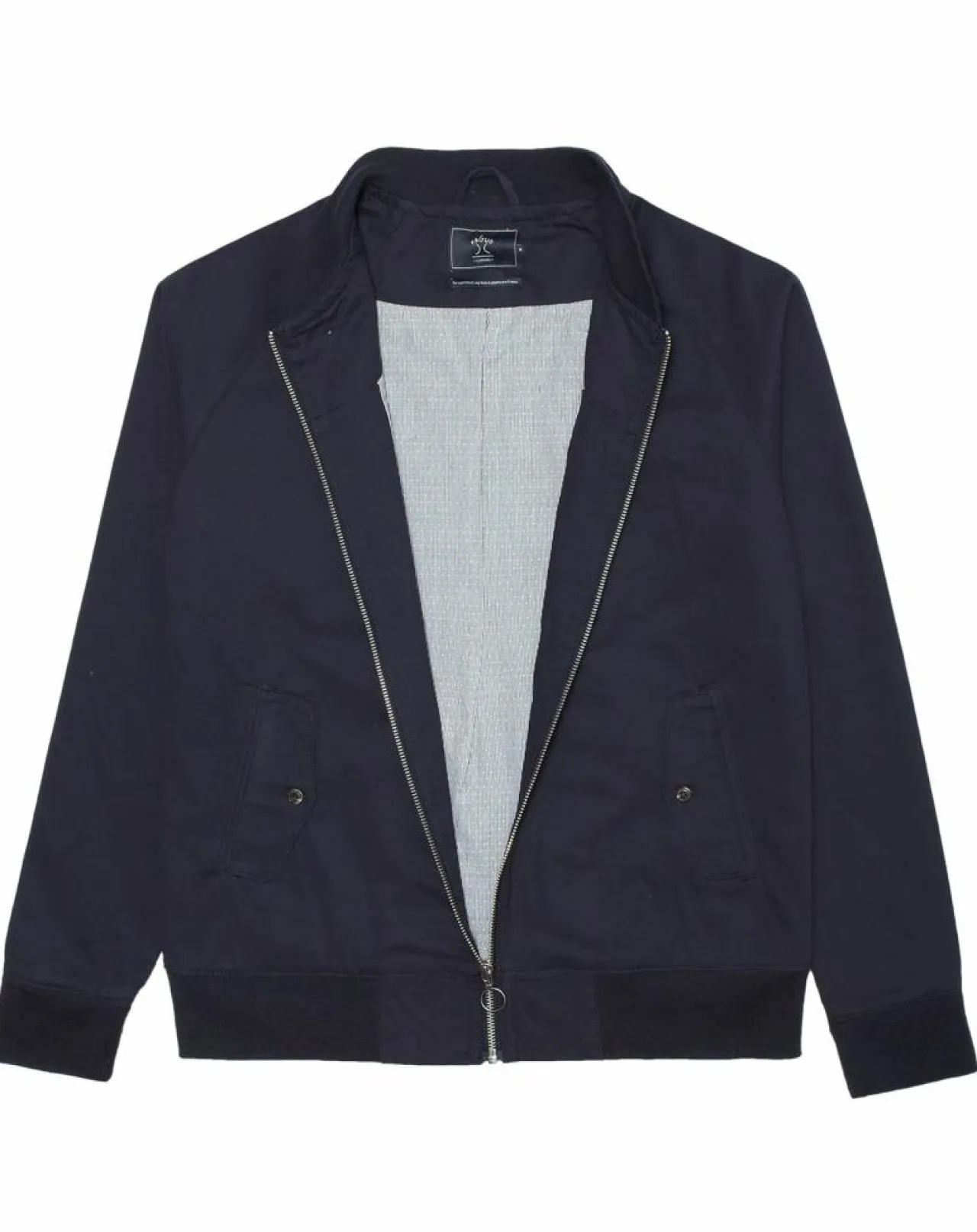 Coupe régular, col teddy et manches raglan pour ce beau blouson HANAU en sergé de coton marine et d’inspiration vintage.